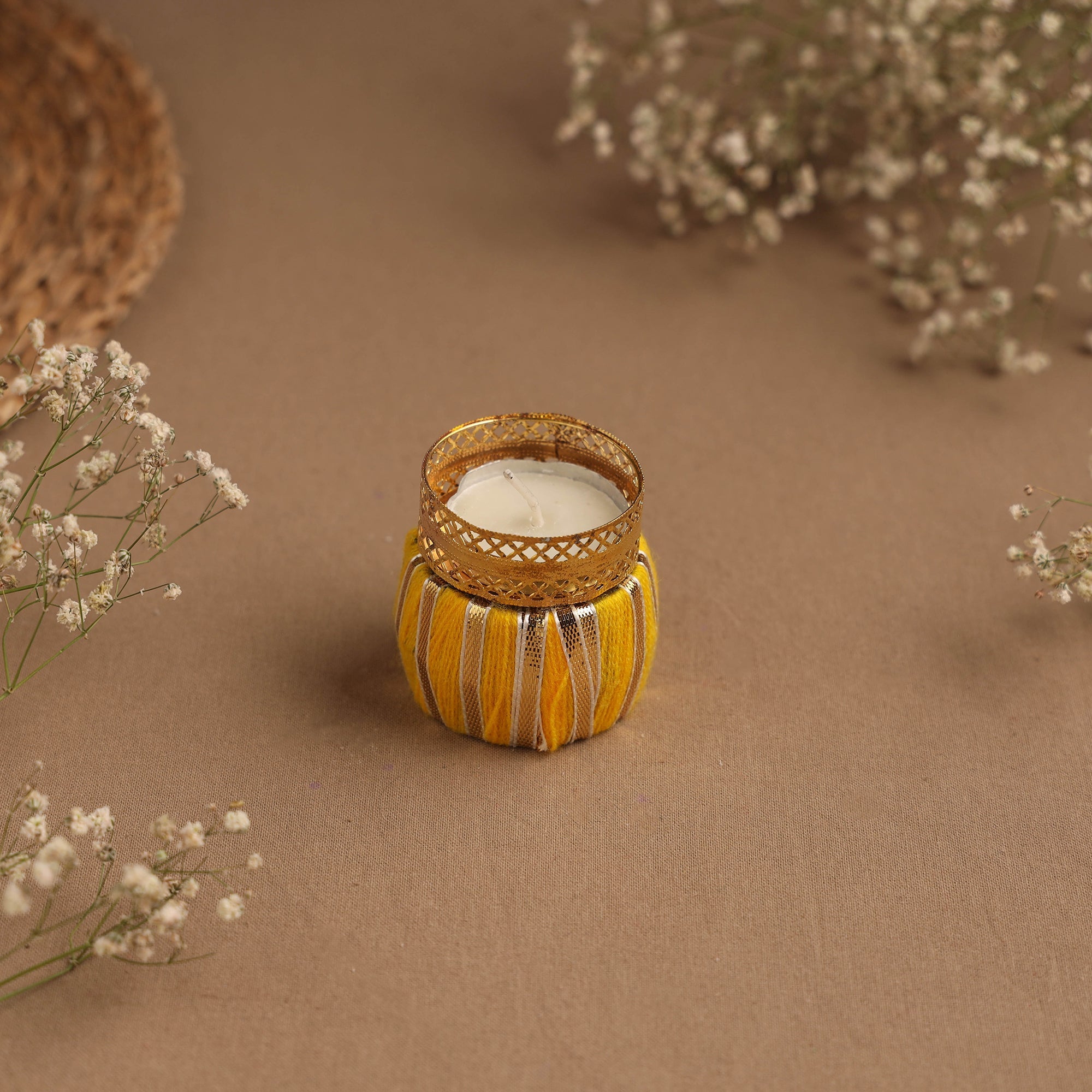 Illuminate your space with our handmade tealight candle holder, a stunning blend of tradition and artistry. Crafted with intricate gota work, this damru designed holder brings vibrant colors and cultural charm to any setting. Perfect for special festival & occasions, it adds a unique touch to your decor.