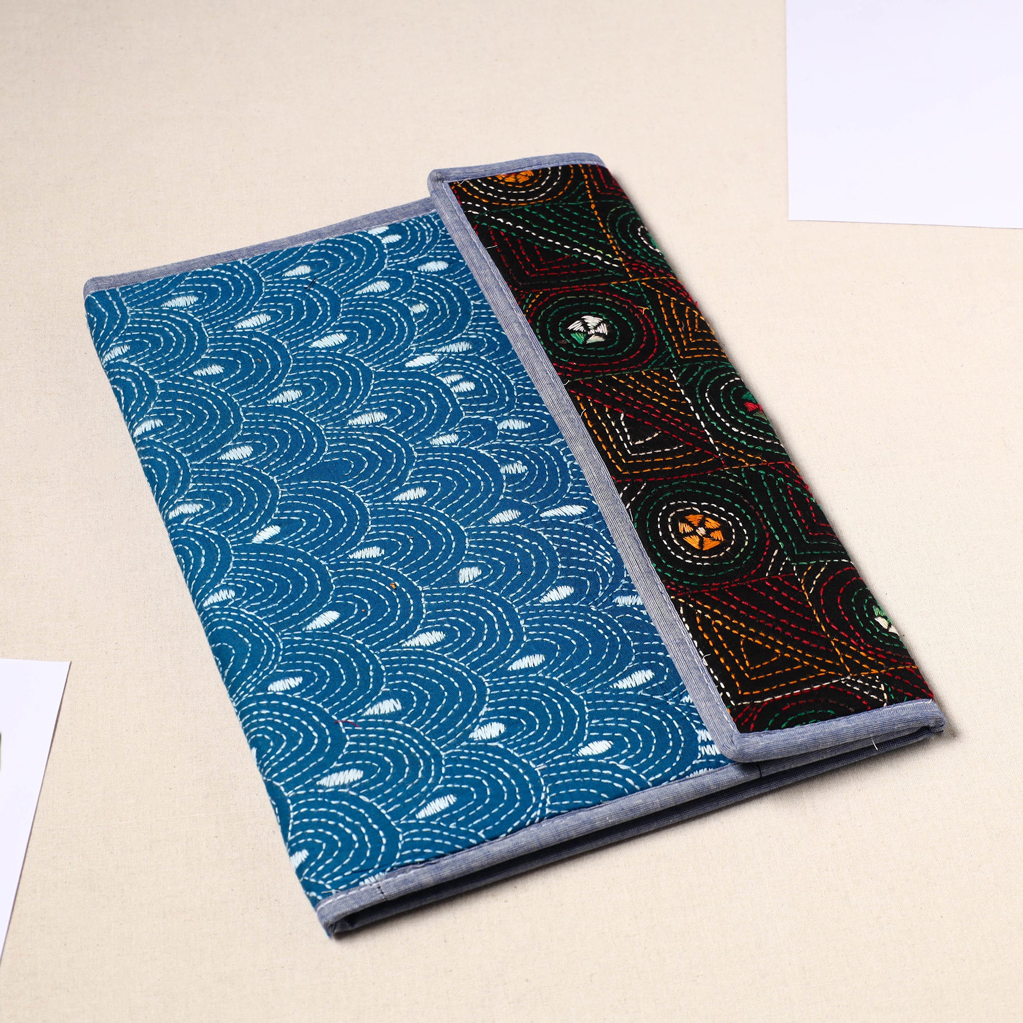 This blue handcrafted bengal kantha work file folder from West Bengal combines artistry and functionality. Intricately designed with traditional running stitches, it reflects the heritage of Bengal’s famous Kantha embroidery. Crafted from durable mount board, it features a clip lock and four spacious pockets for organizing documents. Ideal for personal or professional use, it’s a unique, eco-friendly way to support local artisans.