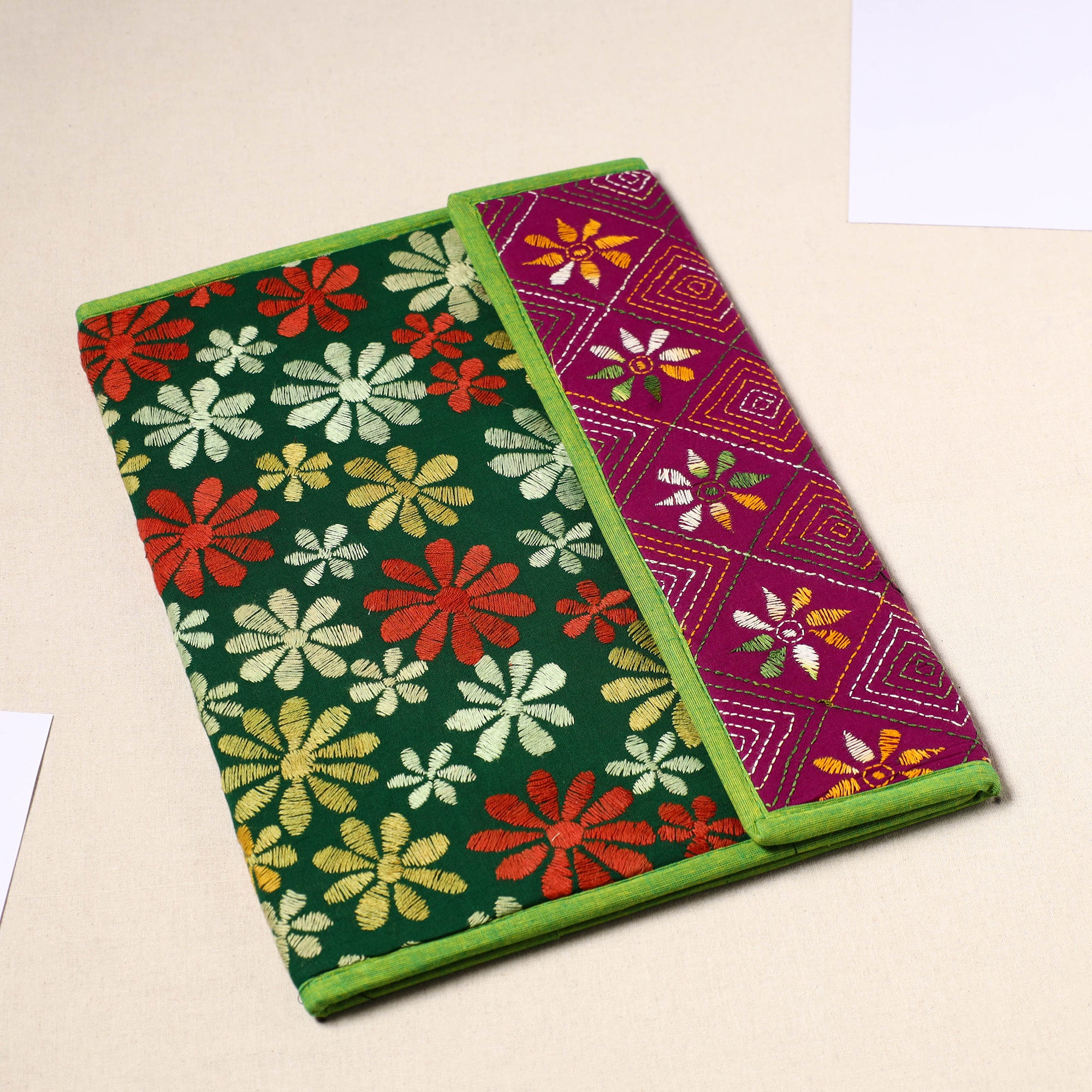 This green handcrafted bengal kantha work file folder from West Bengal combines artistry and functionality. Intricately designed with traditional running stitches, it reflects the heritage of Bengal’s famous Kantha embroidery. Crafted from durable mount board, it features a clip lock and four spacious pockets for organizing documents. Ideal for personal or professional use, it’s a unique, eco-friendly way to support local artisans.