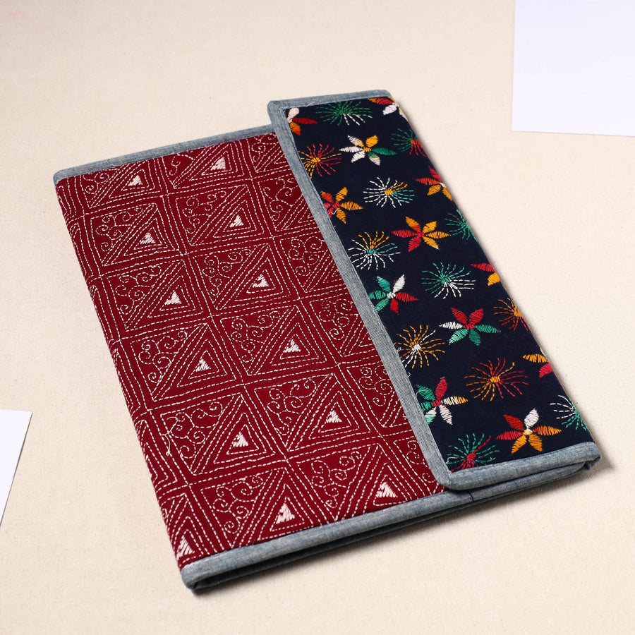 This red handcrafted bengal kantha work file folder from West Bengal combines artistry and functionality. Intricately designed with traditional running stitches, it reflects the heritage of Bengal’s famous Kantha embroidery. Crafted from durable mount board, it features a clip lock and four spacious pockets for organizing documents. Ideal for personal or professional use, it’s a unique, eco-friendly way to support local artisans.