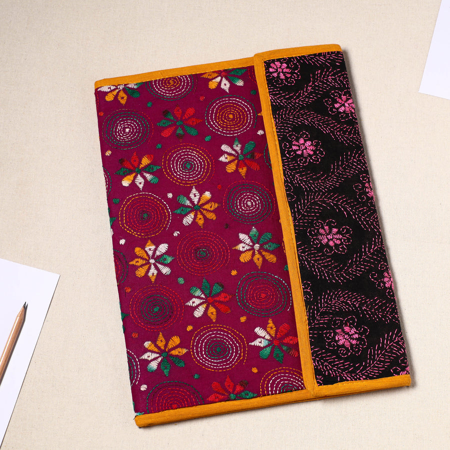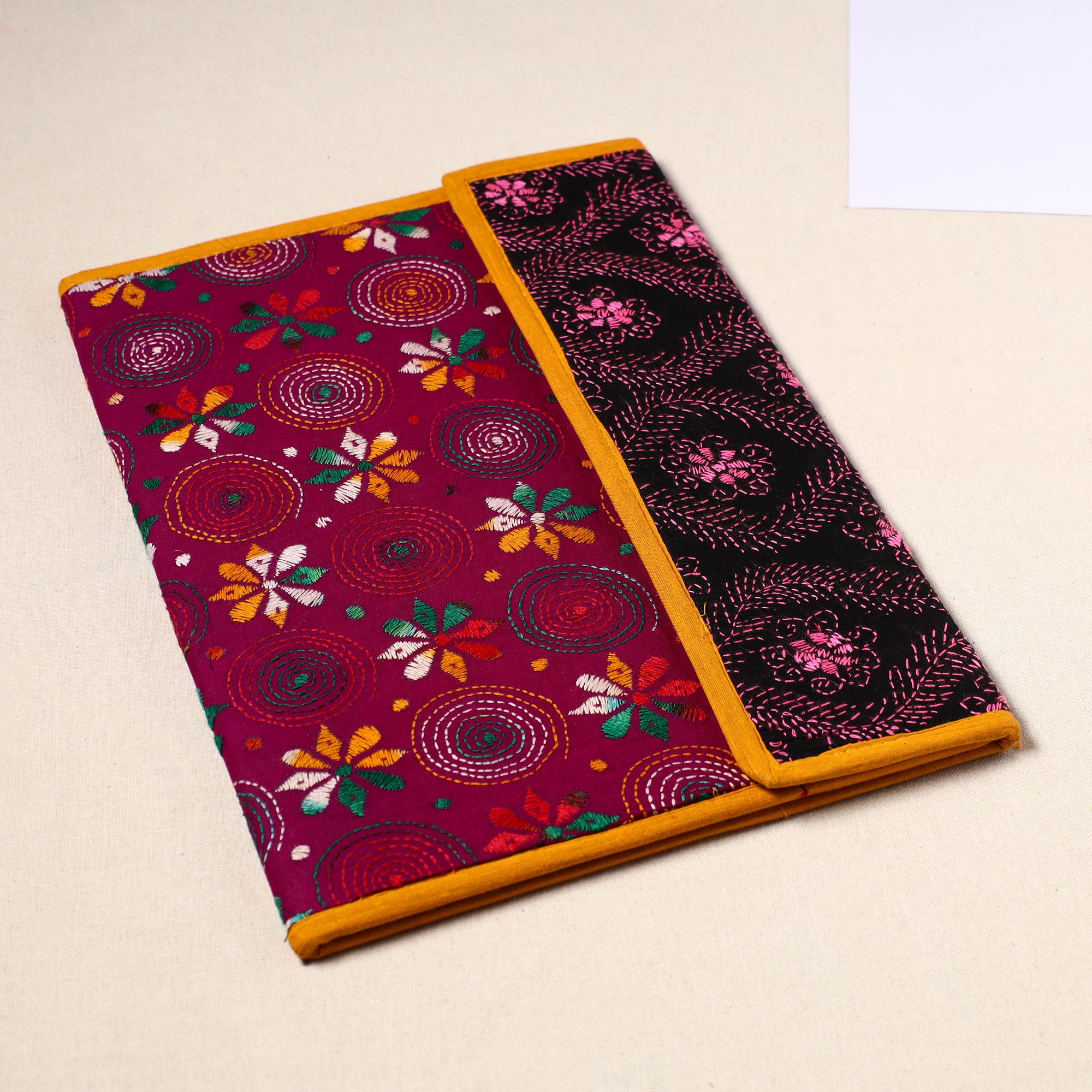This pink handcrafted bengal kantha work file folder from West Bengal combines artistry and functionality. Intricately designed with traditional running stitches, it reflects the heritage of Bengal’s famous Kantha embroidery. Crafted from durable mount board, it features a clip lock and four spacious pockets for organizing documents. Ideal for personal or professional use, it’s a unique, eco-friendly way to support local artisans.