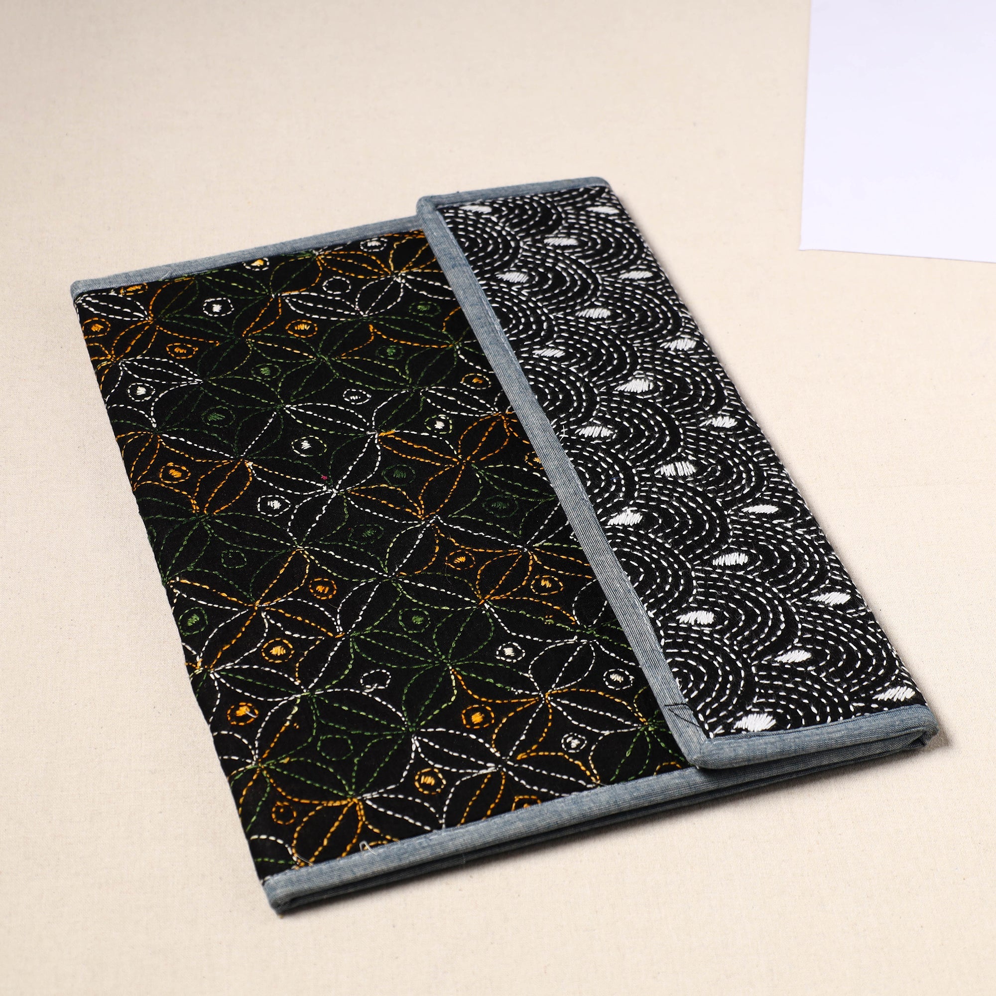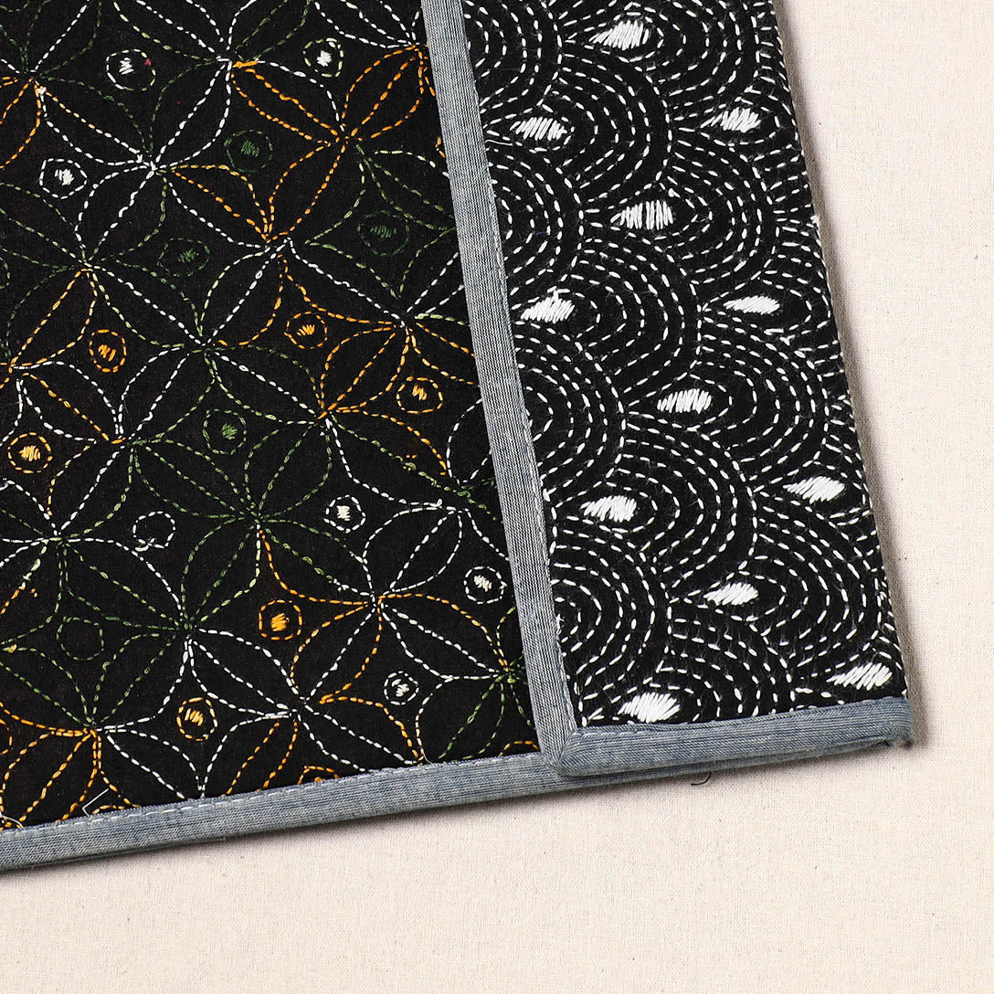 This black handcrafted bengal kantha work file folder from West Bengal combines artistry and functionality. Intricately designed with traditional running stitches, it reflects the heritage of Bengal’s famous Kantha embroidery. Crafted from durable mount board, it features a clip lock and four spacious pockets for organizing documents. Ideal for personal or professional use, it’s a unique, eco-friendly way to support local artisans.