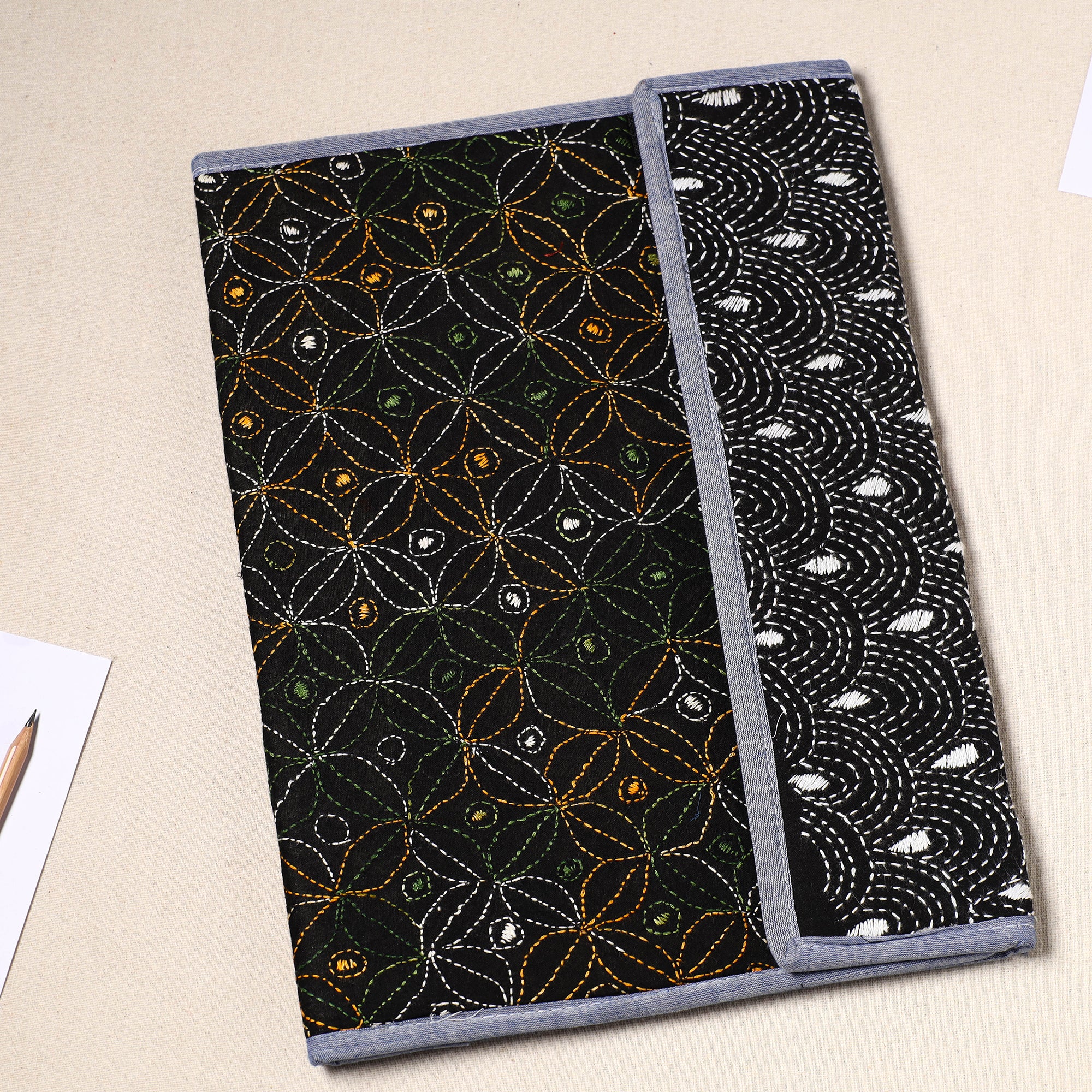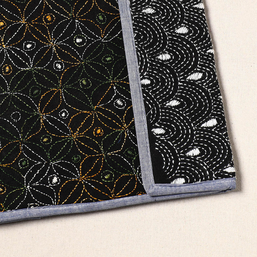 This black handcrafted bengal kantha work file folder from West Bengal combines artistry and functionality. Intricately designed with traditional running stitches, it reflects the heritage of Bengal’s famous Kantha embroidery. Crafted from durable mount board, it features a clip lock and four spacious pockets for organizing documents. Ideal for personal or professional use, it’s a unique, eco-friendly way to support local artisans.