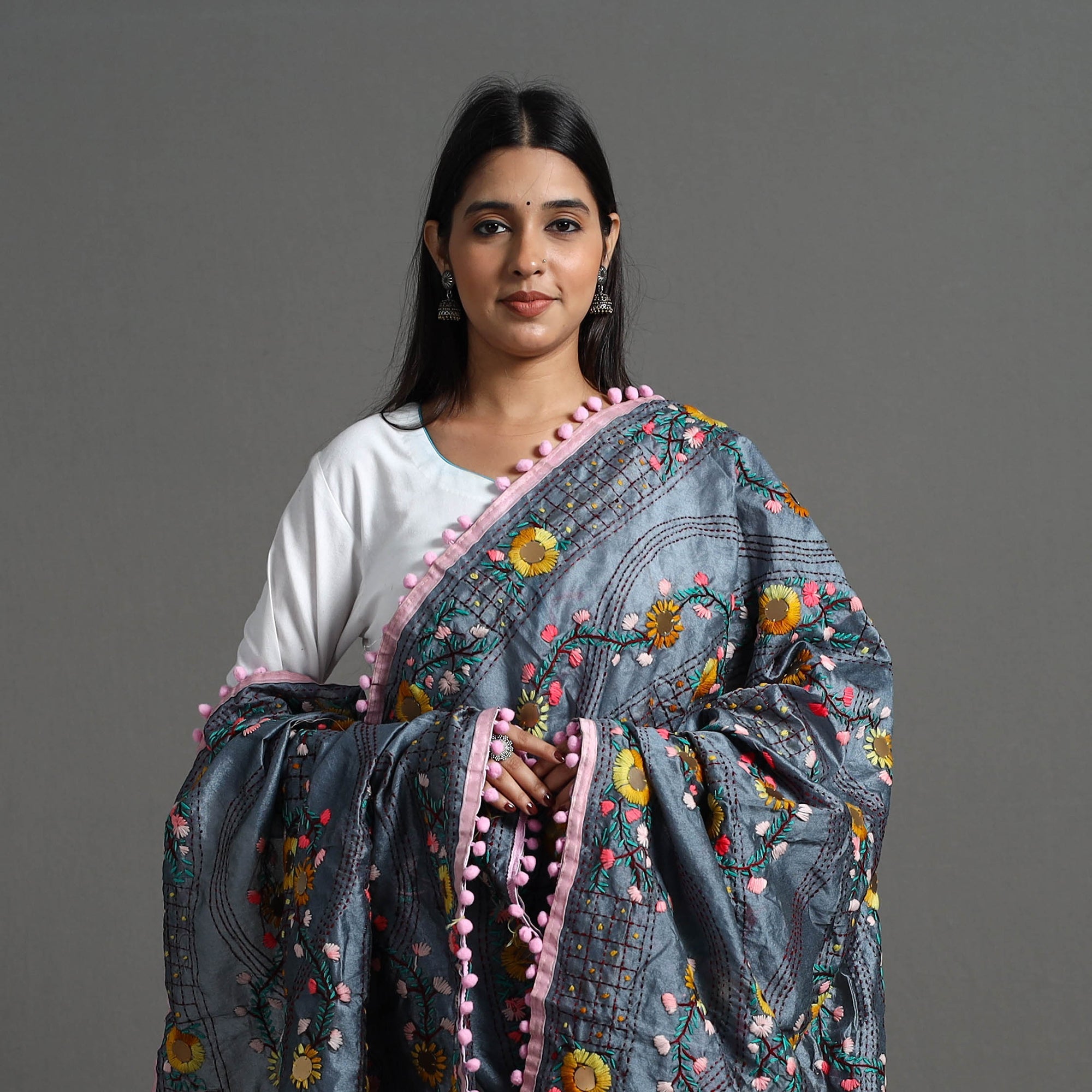 Adorned with mesmerizing grey chanderi silk cotton hand embroidery dupatta, this versatile dupatta exudes elegance and richness. This dupatta is adorned with pom pom. The choice of vibrant colour play makes this gorgeous dupatta a visual treat.