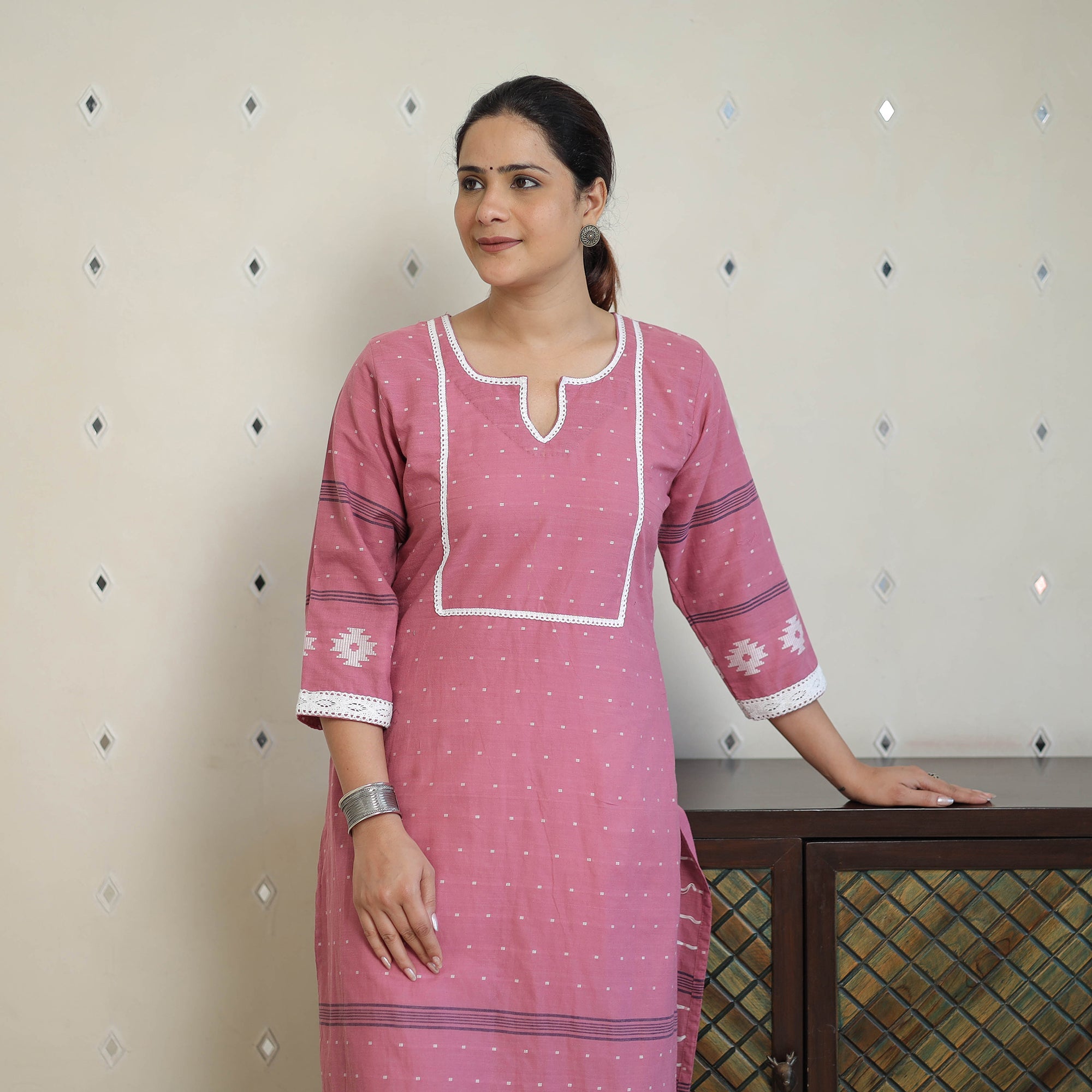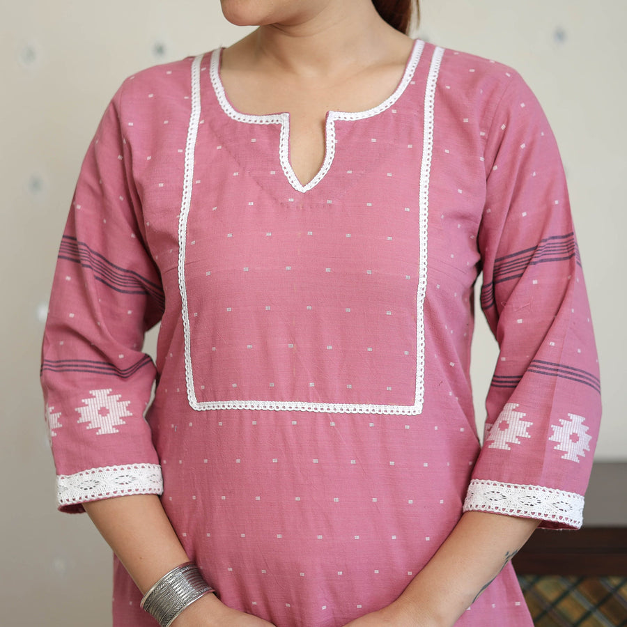 This beautiful, exquisitely designed jacquard kurta with lace work is perfect for both daily wear and special occasions. Crafted from cotton, it offers a soft and comfortable feel, boasting elegant jacquard weave patterns. With a handy side pocket, it’s practical and stylish.