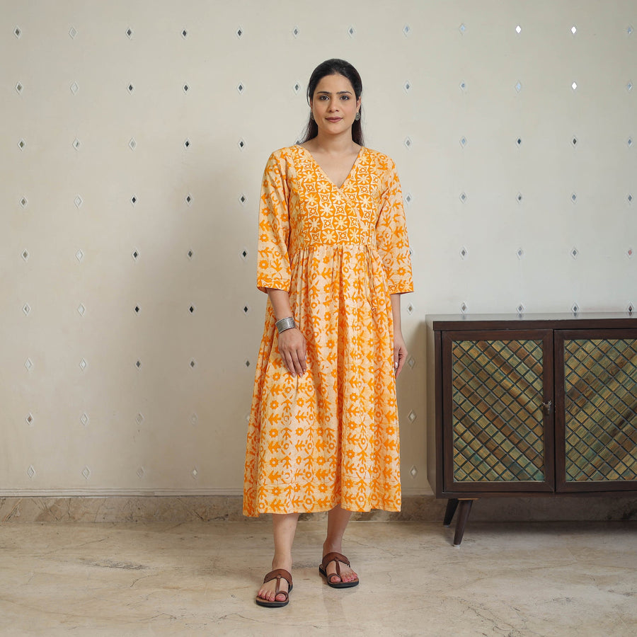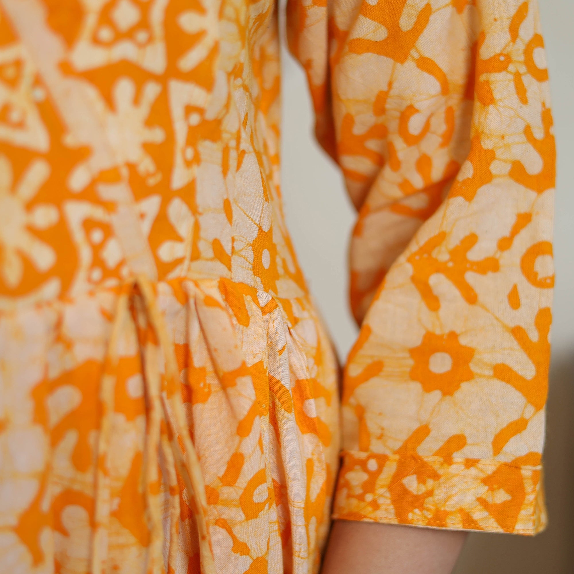 This angrakha batik print dress is a fusion of timeless elegance and modern comfort. Crafted using batik techniques, the intricate patterns add a touch of artistry to your wardrobe. The cotton fabric ensures, making it perfect for all-day wear, whether you're heading out for a casual outing.