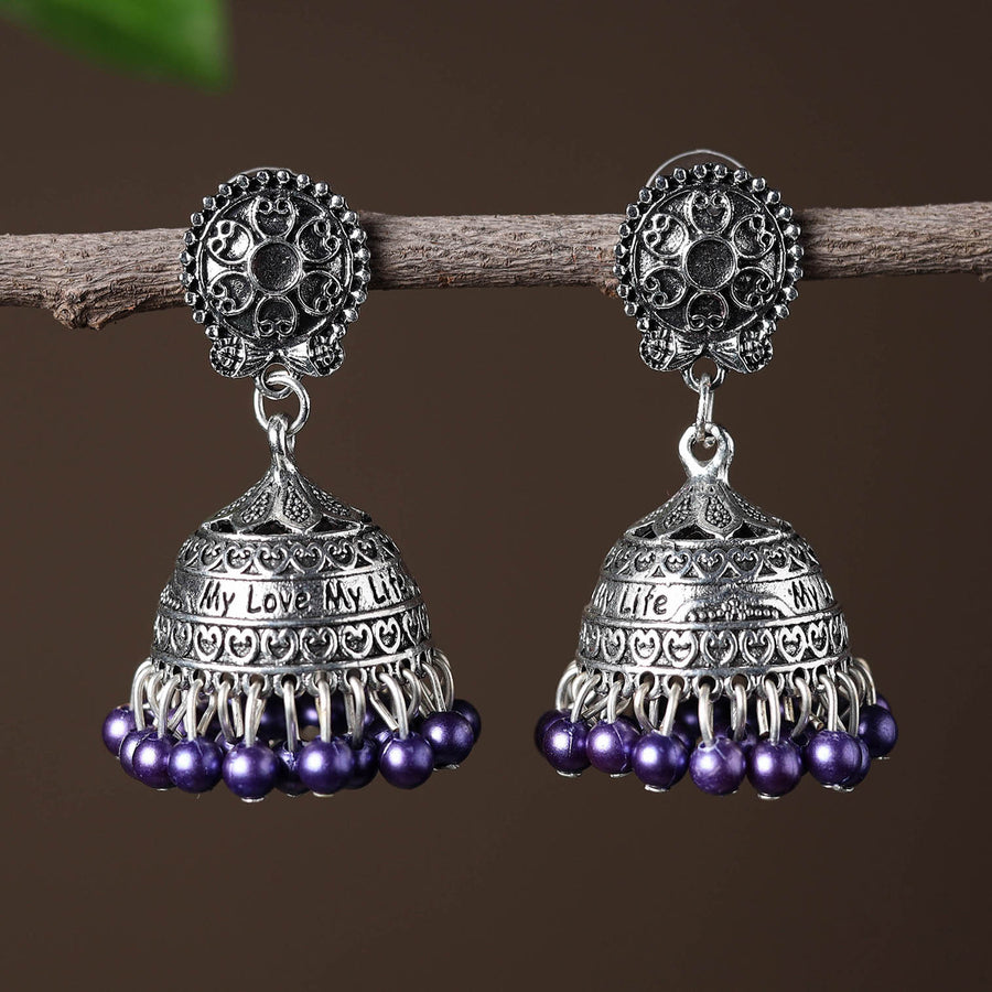 These grey handcrafted oxidised german silver jhumki earrings bring together the beauty of traditional craftsmanship with a touch of contemporary elegance. Featuring intricate beadwork detailing, they make the perfect accessory for both casual and festive outfits.