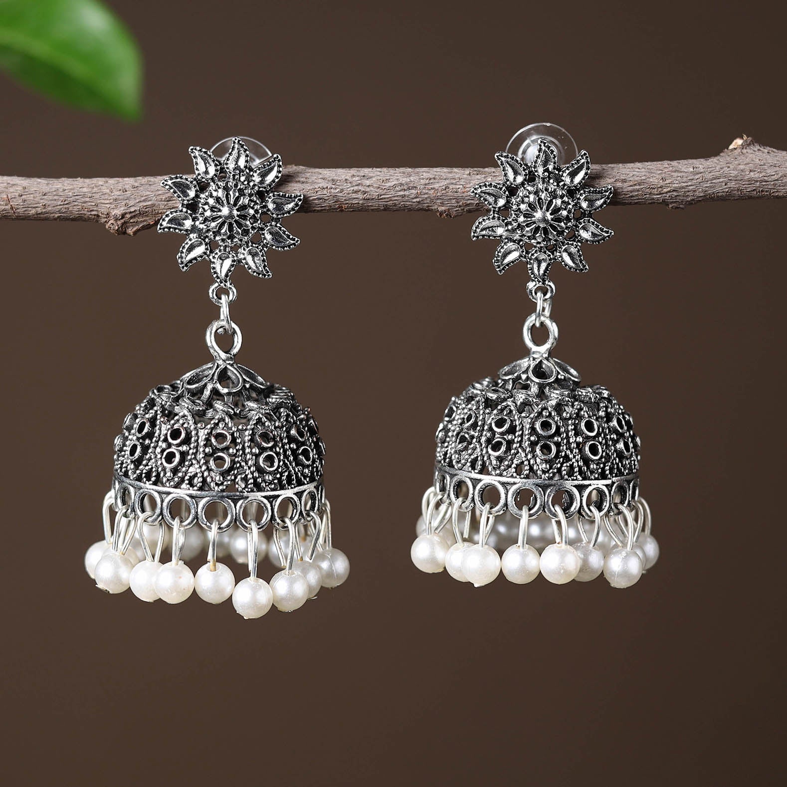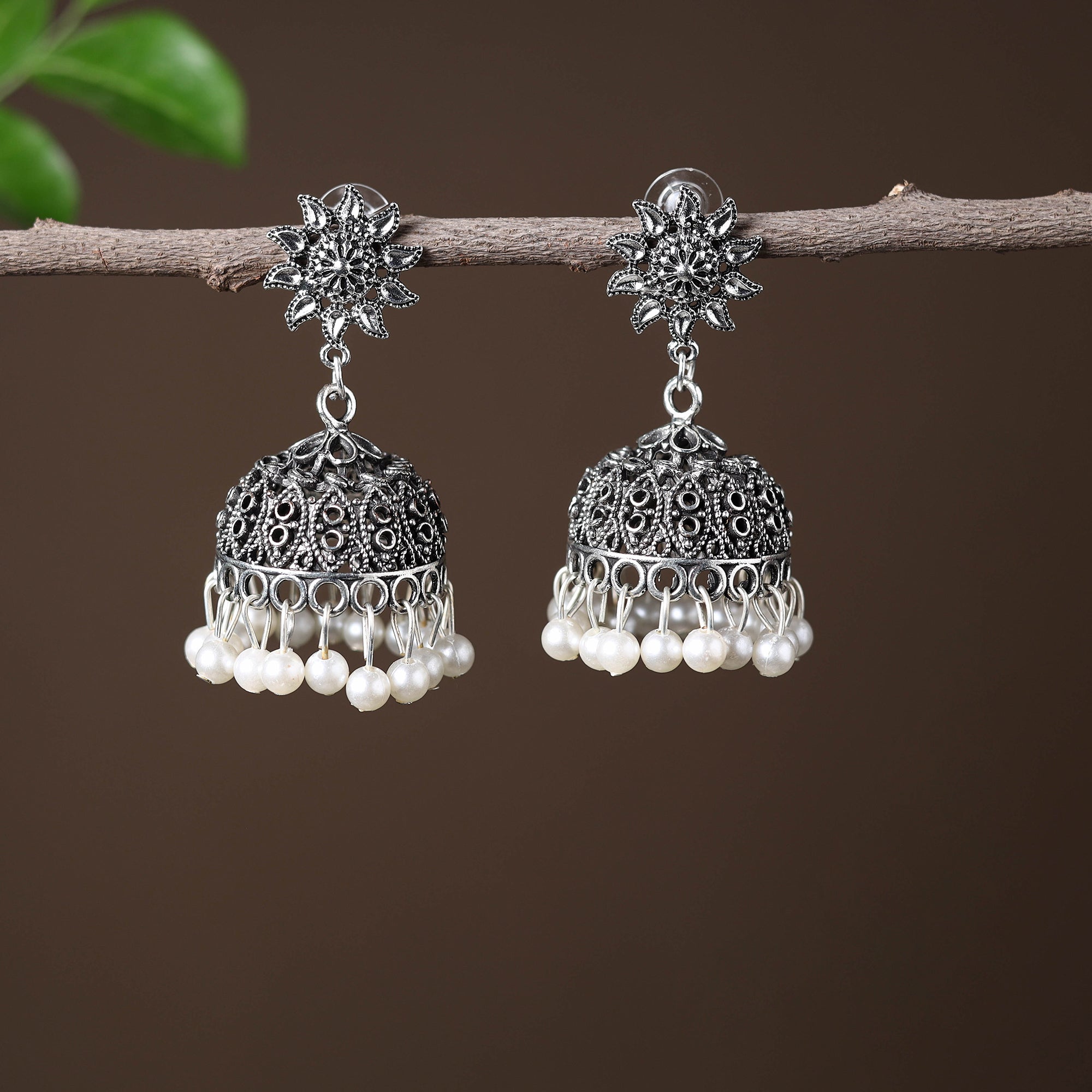 These grey handcrafted oxidised german silver jhumki earrings bring together the beauty of traditional craftsmanship with a touch of contemporary elegance. Featuring intricate beadwork detailing, they make the perfect accessory for both casual and festive outfits.