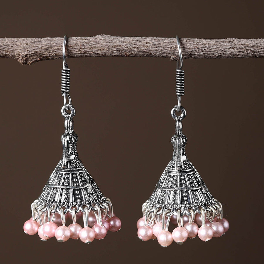 These grey handcrafted oxidised german silver jhumki earrings bring together the beauty of traditional craftsmanship with a touch of contemporary elegance. Featuring intricate beadwork detailing, they make the perfect accessory for both casual and festive outfits.