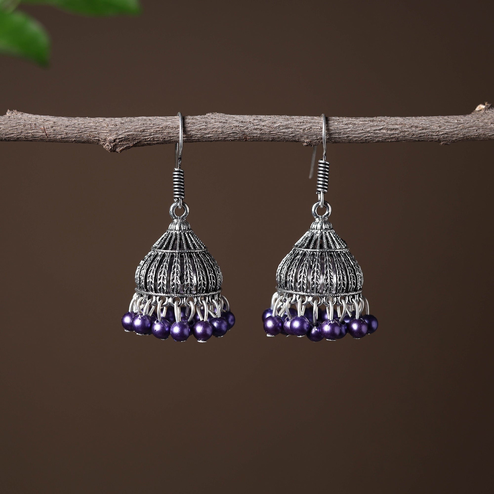 These grey handcrafted oxidised german silver jhumki earrings bring together the beauty of traditional craftsmanship with a touch of contemporary elegance. Featuring intricate beadwork detailing, they make the perfect accessory for both casual and festive outfits.