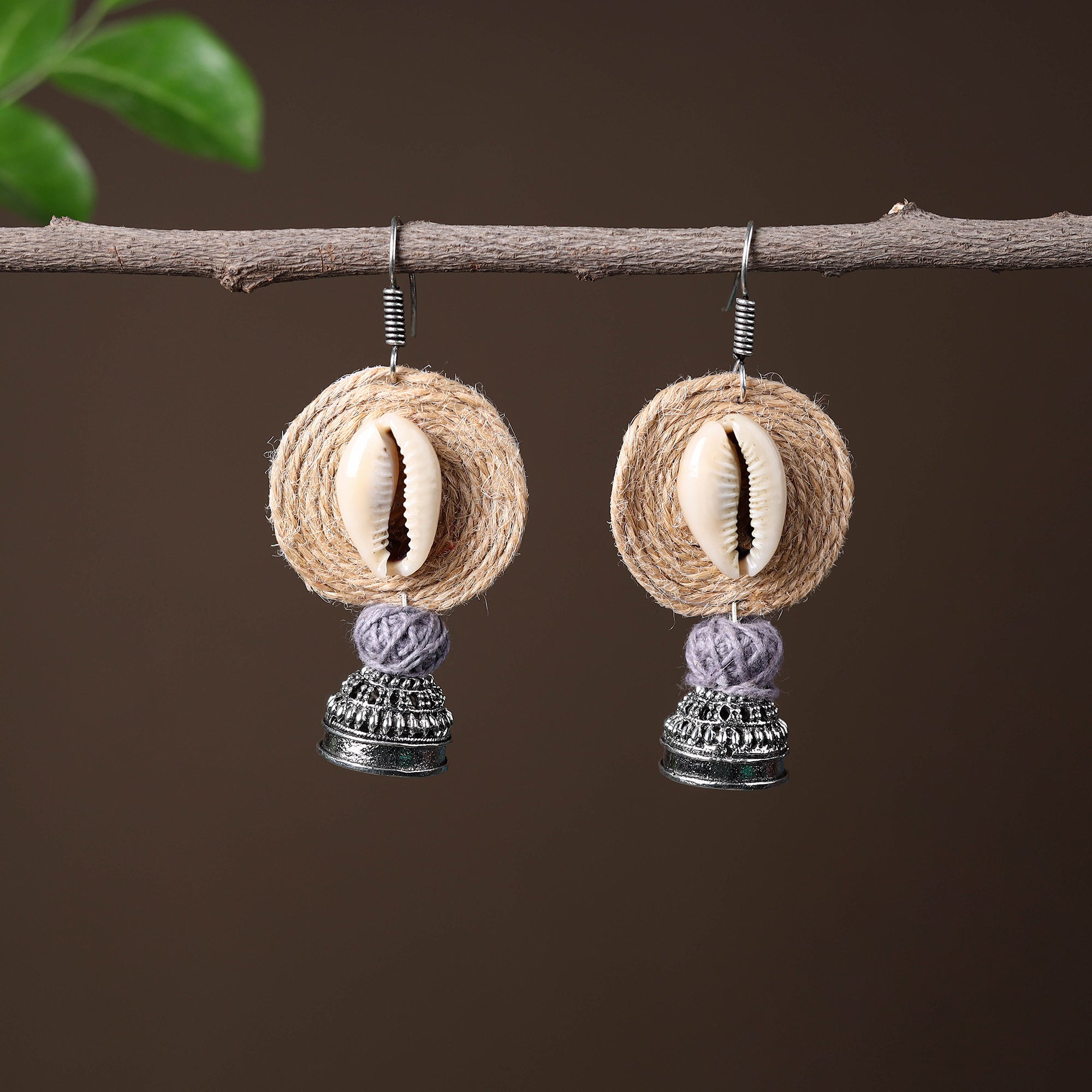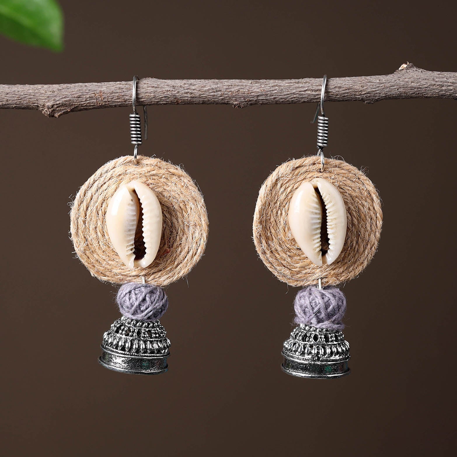 These beige handcrafted oxidised german silver jhumki earrings bring together the beauty of traditional craftsmanship with a touch of contemporary elegance. Featuring intricate jute, seashell and thread detailing, they make the perfect accessory for both casual and festive outfits.