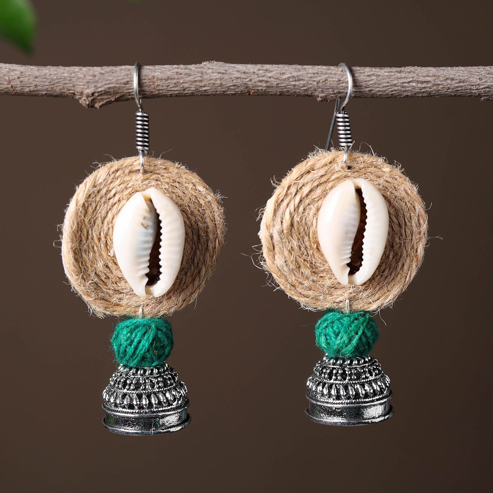 These beige handcrafted oxidised german silver jhumki earrings bring together the beauty of traditional craftsmanship with a touch of contemporary elegance. Featuring intricate jute, seashell and thread detailing, they make the perfect accessory for both casual and festive outfits.