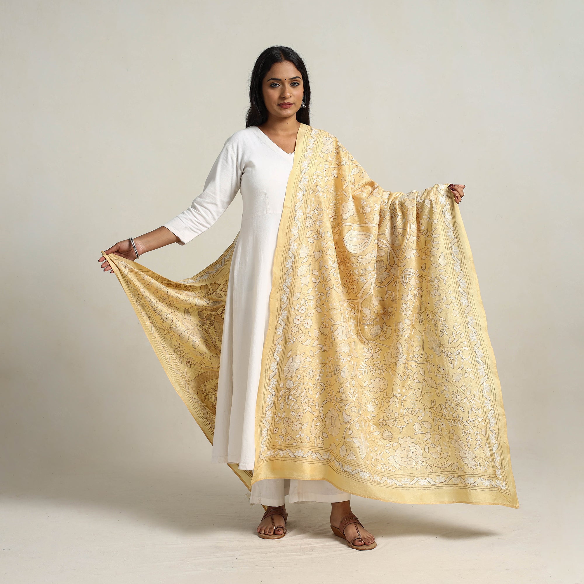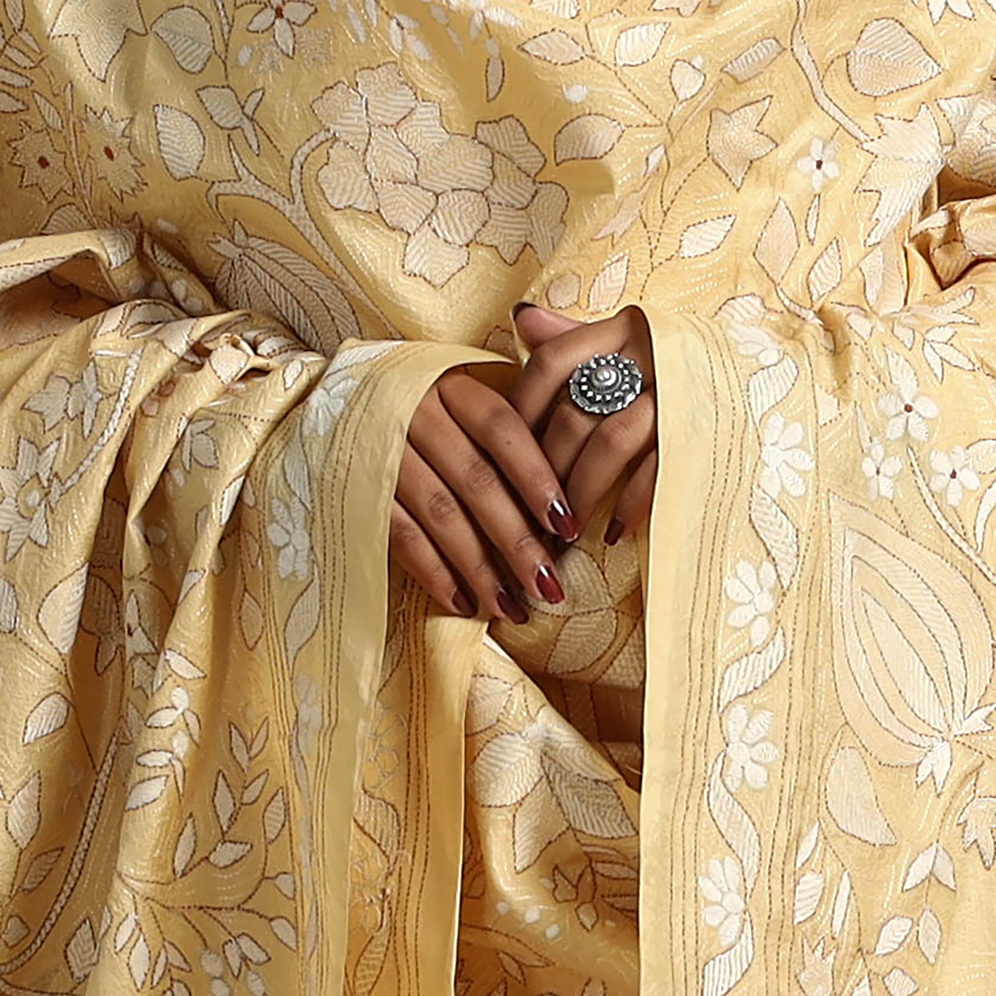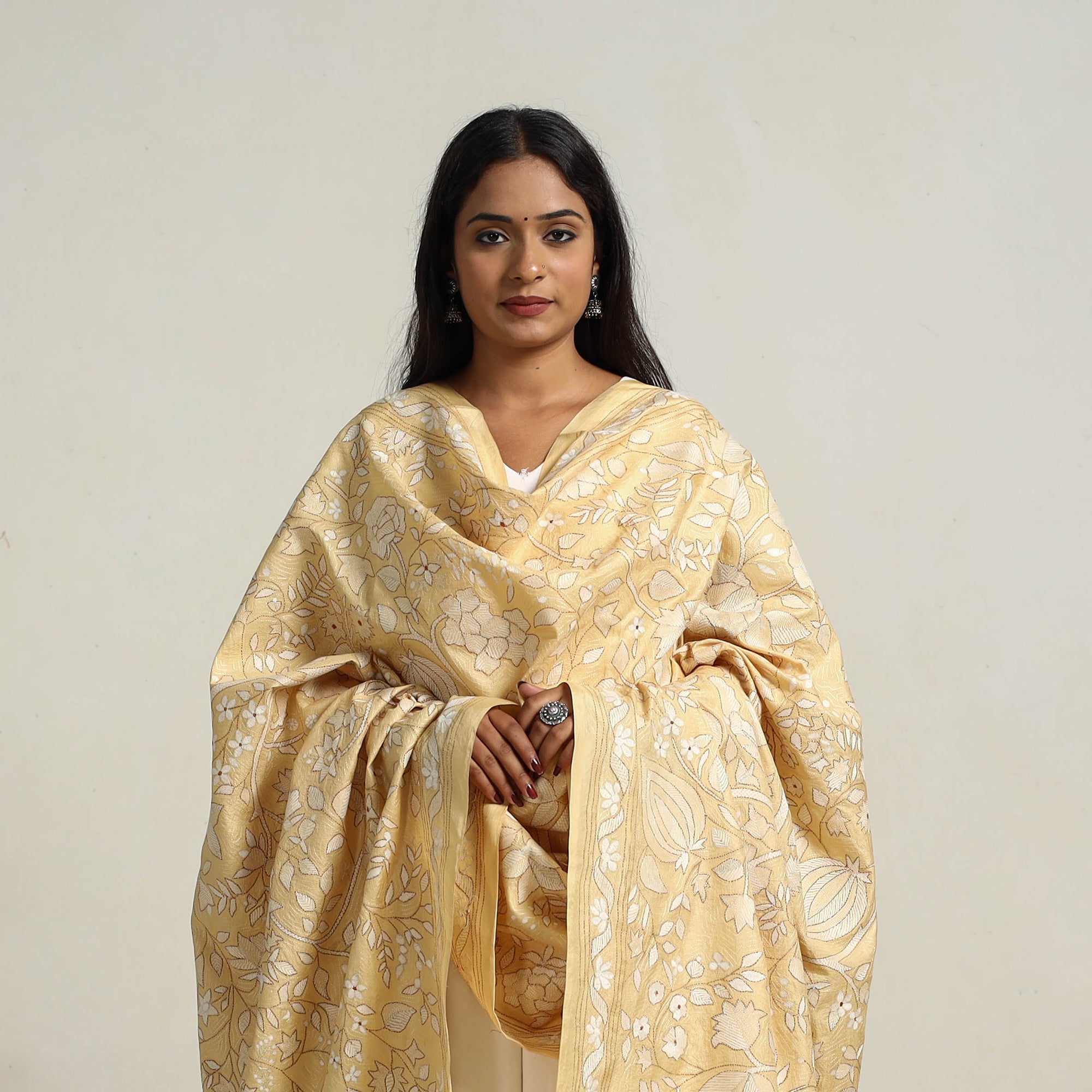 This hand-embroidered kantha dupatta is a masterpiece from Bengal, crafted by skilled artisans Alima Khatun from Bolpur West Bengal. Made from pure silk, Each hand embroidery narrates the region's rich cultural heritage and the art of kantha. Soft, lightweight, and versatile, this dupatta is ideal for all seasons and can be styled for both casual and formal occasions.