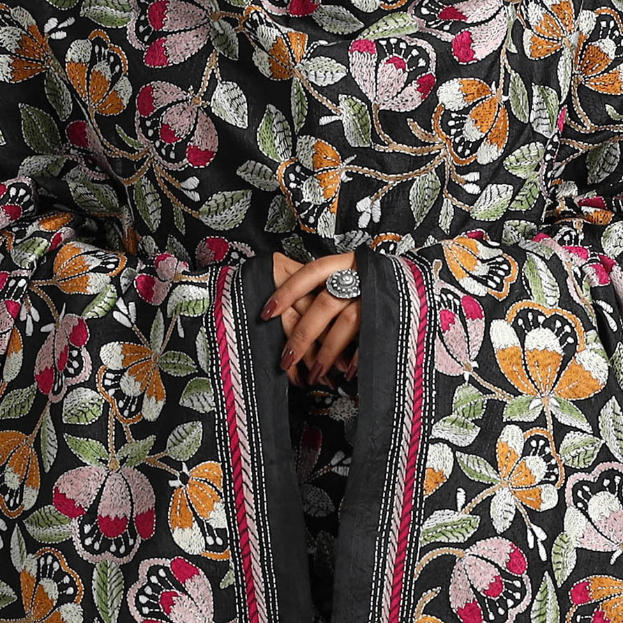 This hand-embroidered kantha dupatta is a masterpiece from Bengal, crafted by skilled artisans Alima Khatun from Bolpur West Bengal. Made from pure silk, Each hand embroidery narrates the region's rich cultural heritage and the art of kantha. Soft, lightweight, and versatile, this dupatta is ideal for all seasons and can be styled for both casual and formal occasions.