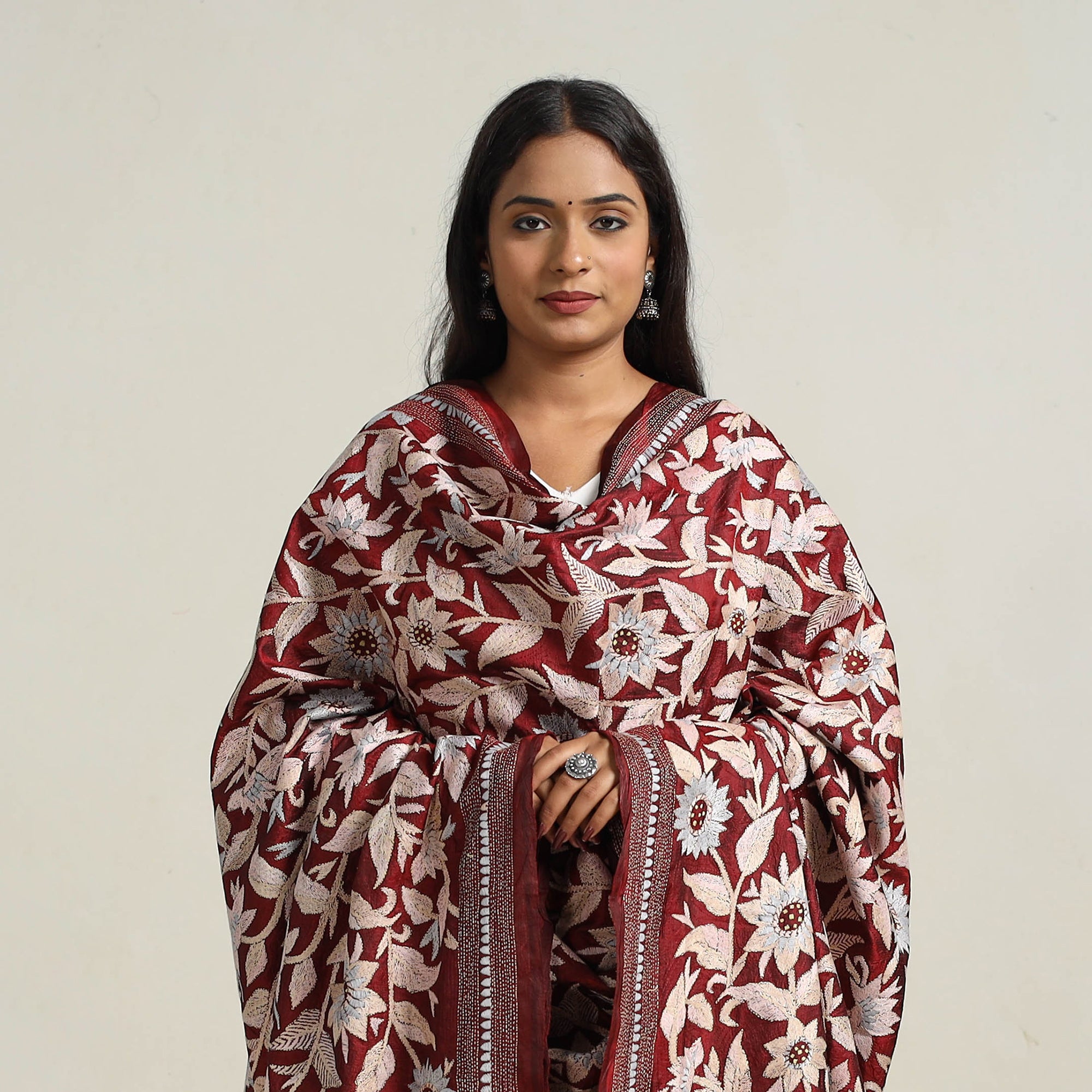 This hand-embroidered kantha dupatta is a masterpiece from Bengal, crafted by skilled artisans Alima Khatun from Bolpur West Bengal. Made from pure silk, Each hand embroidery narrates the region's rich cultural heritage and the art of kantha. Soft, lightweight, and versatile, this dupatta is ideal for all seasons and can be styled for both casual and formal occasions.
