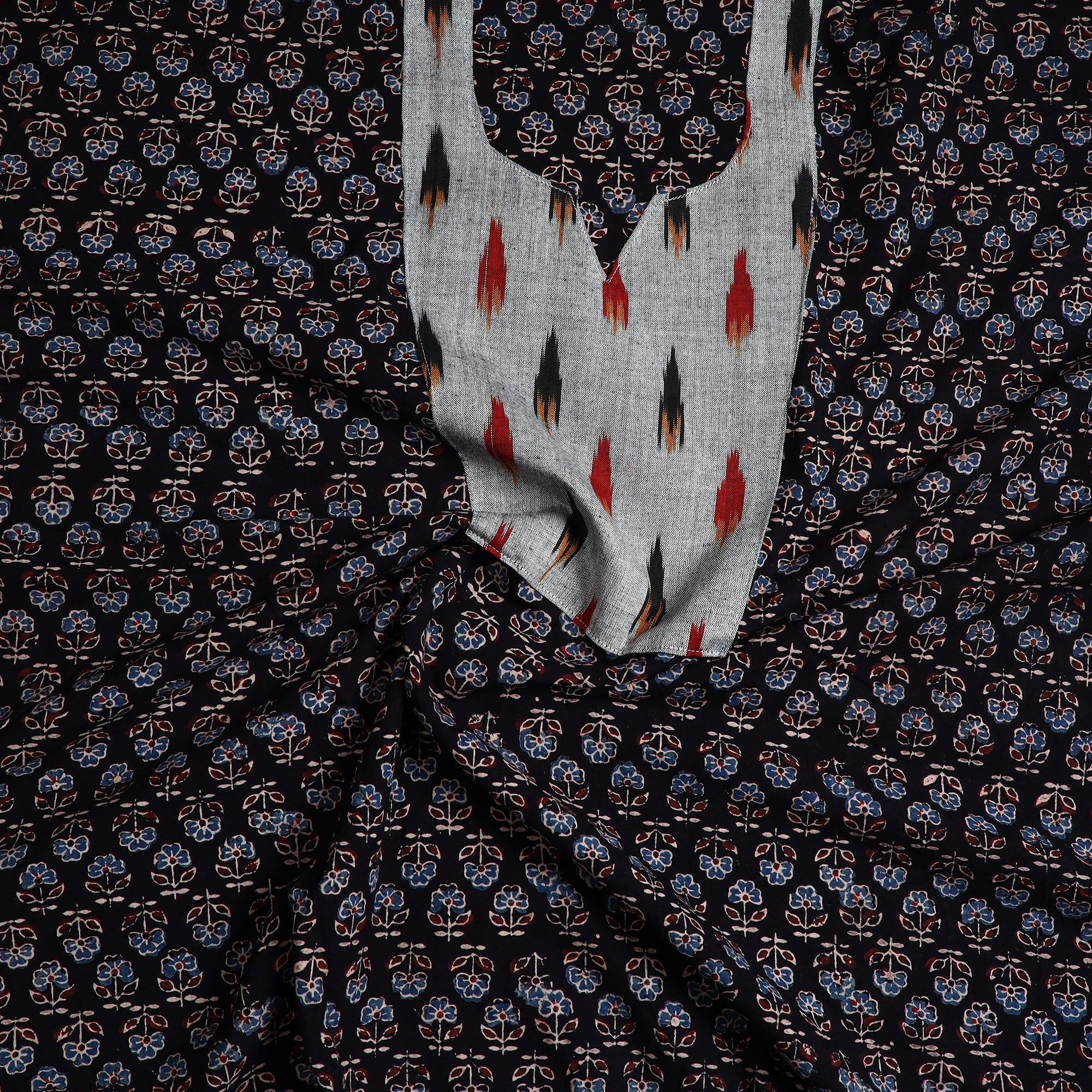 This cotton ajrakh kurta material is crafted by artisans from Kutch, Gujarat, using traditional block-printing techniques. Made with intricate patterns, it offers both elegance and comfort for any special occasion. The reflects the rich heritage of ajrakh block printing, making it an ideal choice for those who value both tradition and sustainability.