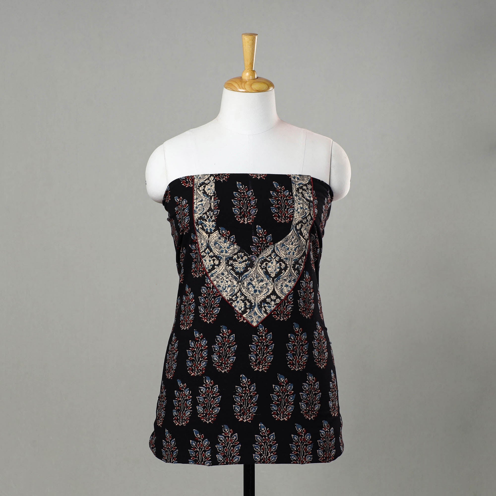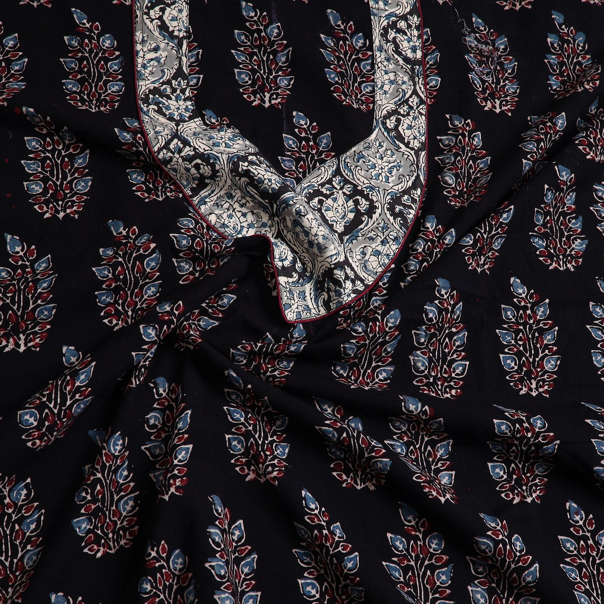 This cotton ajrakh kurta material is crafted by artisans from Kutch, Gujarat, using traditional block-printing techniques. Made with intricate patterns, it offers both elegance and comfort for any special occasion. The reflects the rich heritage of ajrakh block printing, making it an ideal choice for those who value both tradition and sustainability.
