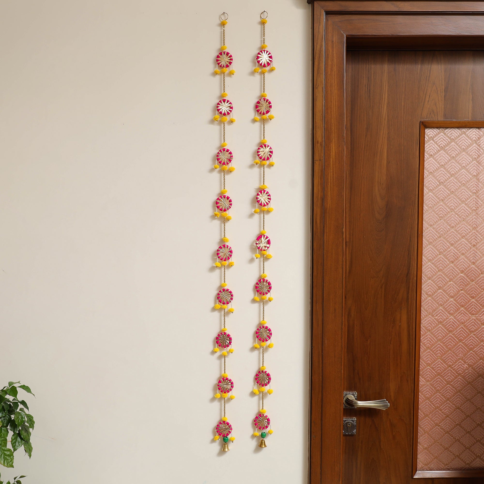 | Material | This handmade gota and beadwork wall hanging (set of 2) is the perfect addition to your diwali or festive decor. Crafted by skilled artisans, the design features traditional threadwork, gota, beads, and pompoms, making it a charming addition to diwali or any festive occasion. Its elegant, handmade design brings cultural richness and blessings to your space. |