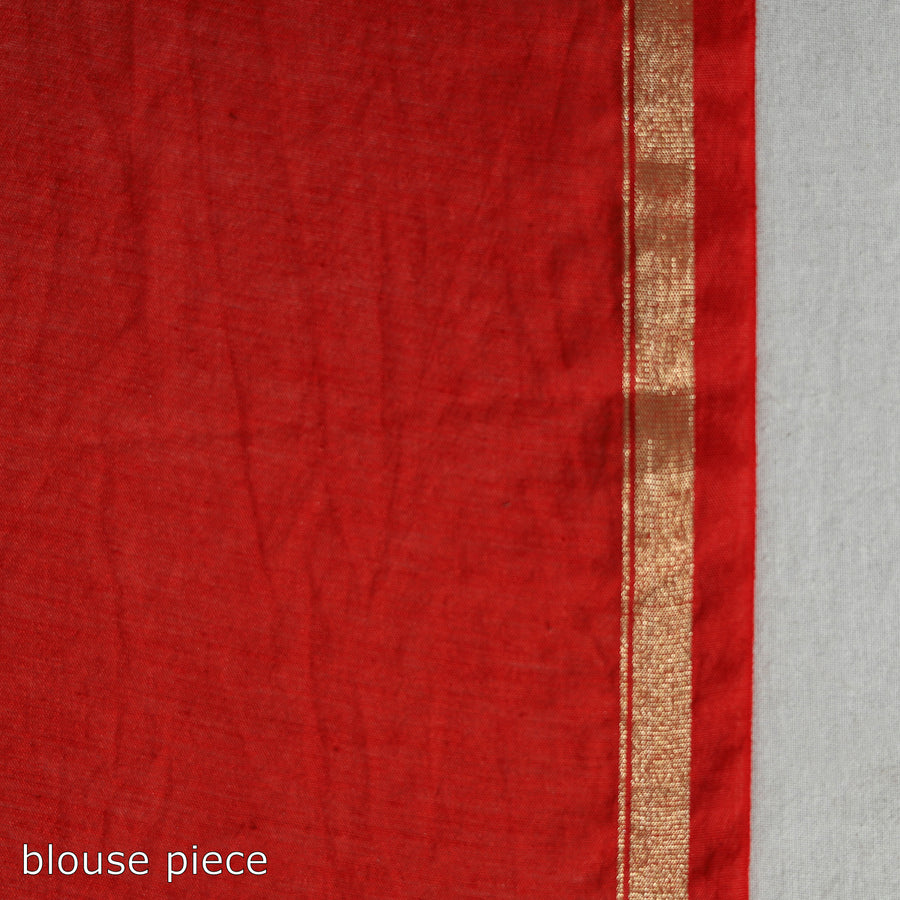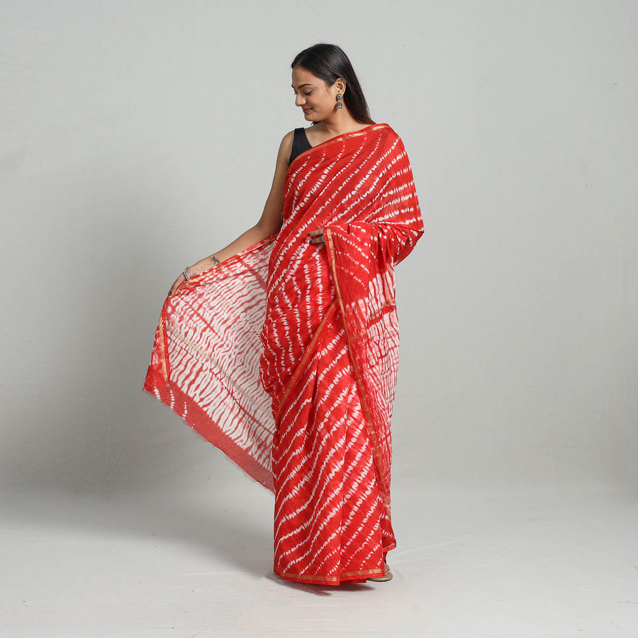 Red chanderi silk cotton shibori tie-dye saree with zari border. This saree is hand dyed using the shibori tie and dye technique, in which the fabric is tied using a clamp or stitches in the required design and the pattern is dyed. Chanderi silk is known for its gossamer looks and amazing feel. Perfect for special occasions or cultural events.