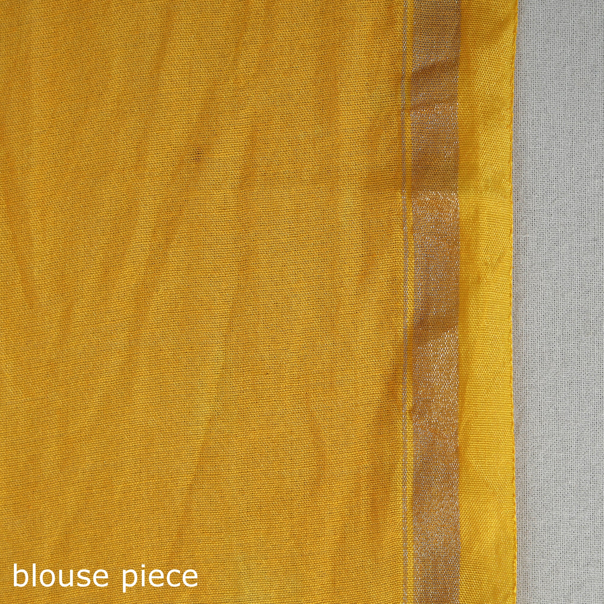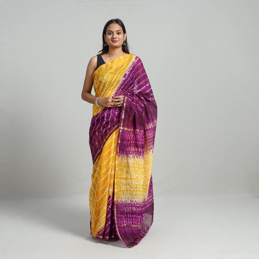 Orange chanderi silk cotton shibori tie-dye saree with zari border. This saree is hand dyed using the shibori tie and dye technique, in which the fabric is tied using a clamp or stitches in the required design and the pattern is dyed. Chanderi silk is known for its gossamer looks and amazing feel. Perfect for special occasions or cultural events.