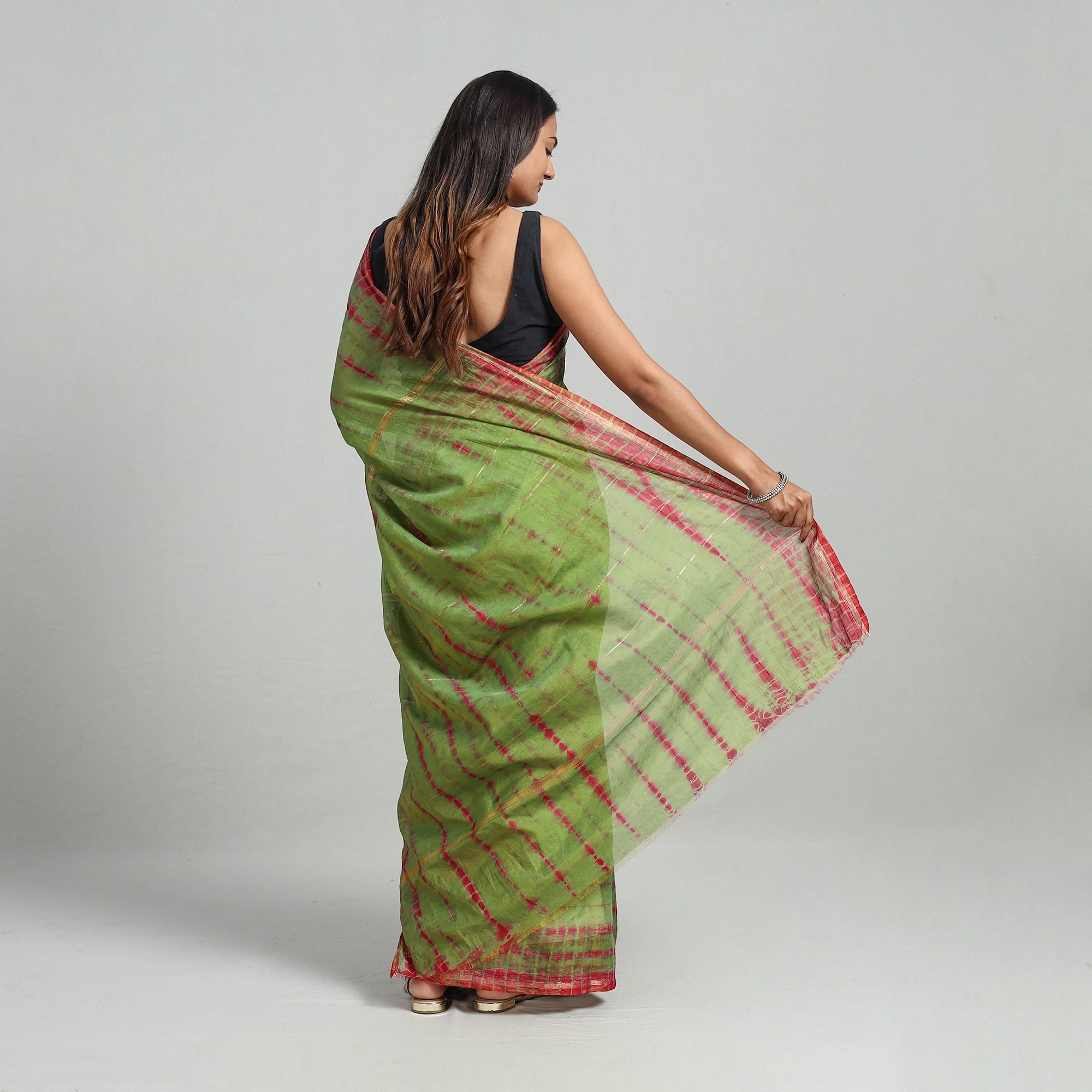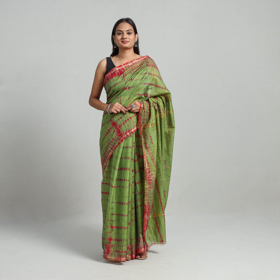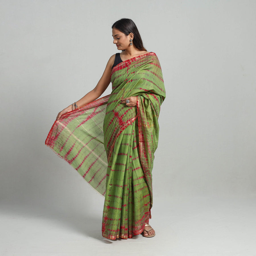 Green chanderi silk cotton shibori tie-dye saree with zari border. This saree is hand dyed using the shibori tie and dye technique, in which the fabric is tied using a clamp or stitches in the required design and the pattern is dyed. Chanderi silk is known for its gossamer looks and amazing feel. Perfect for special occasions or cultural events.