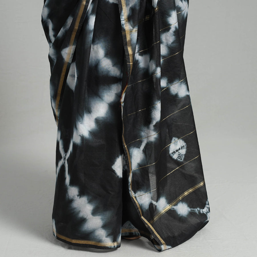 Black chanderi silk cotton shibori tie-dye saree with zari border. This saree is hand dyed using the shibori tie and dye technique, in which the fabric is tied using a clamp or stitches in the required design and the pattern is dyed. Chanderi silk is known for its gossamer looks and amazing feel. Perfect for special occasions or cultural events.