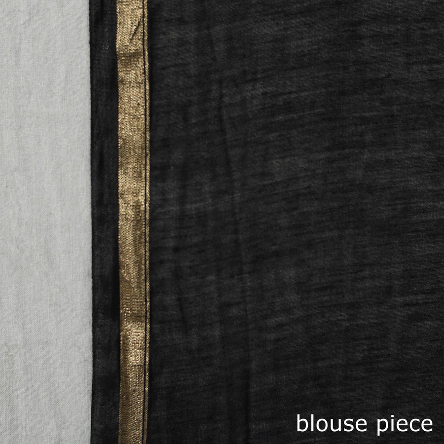 Black chanderi silk cotton shibori tie-dye saree with zari border. This saree is hand dyed using the shibori tie and dye technique, in which the fabric is tied using a clamp or stitches in the required design and the pattern is dyed. Chanderi silk is known for its gossamer looks and amazing feel. Perfect for special occasions or cultural events.
