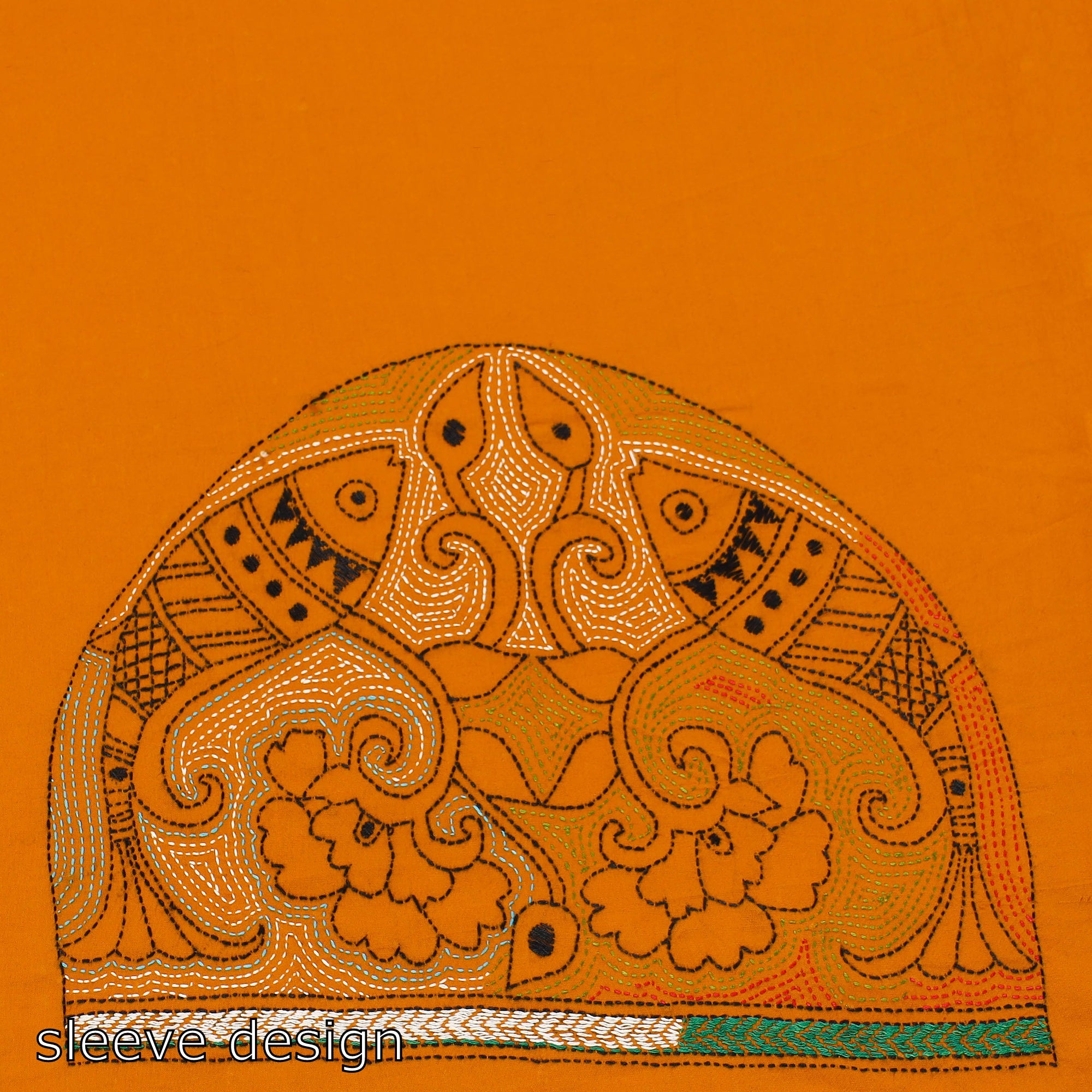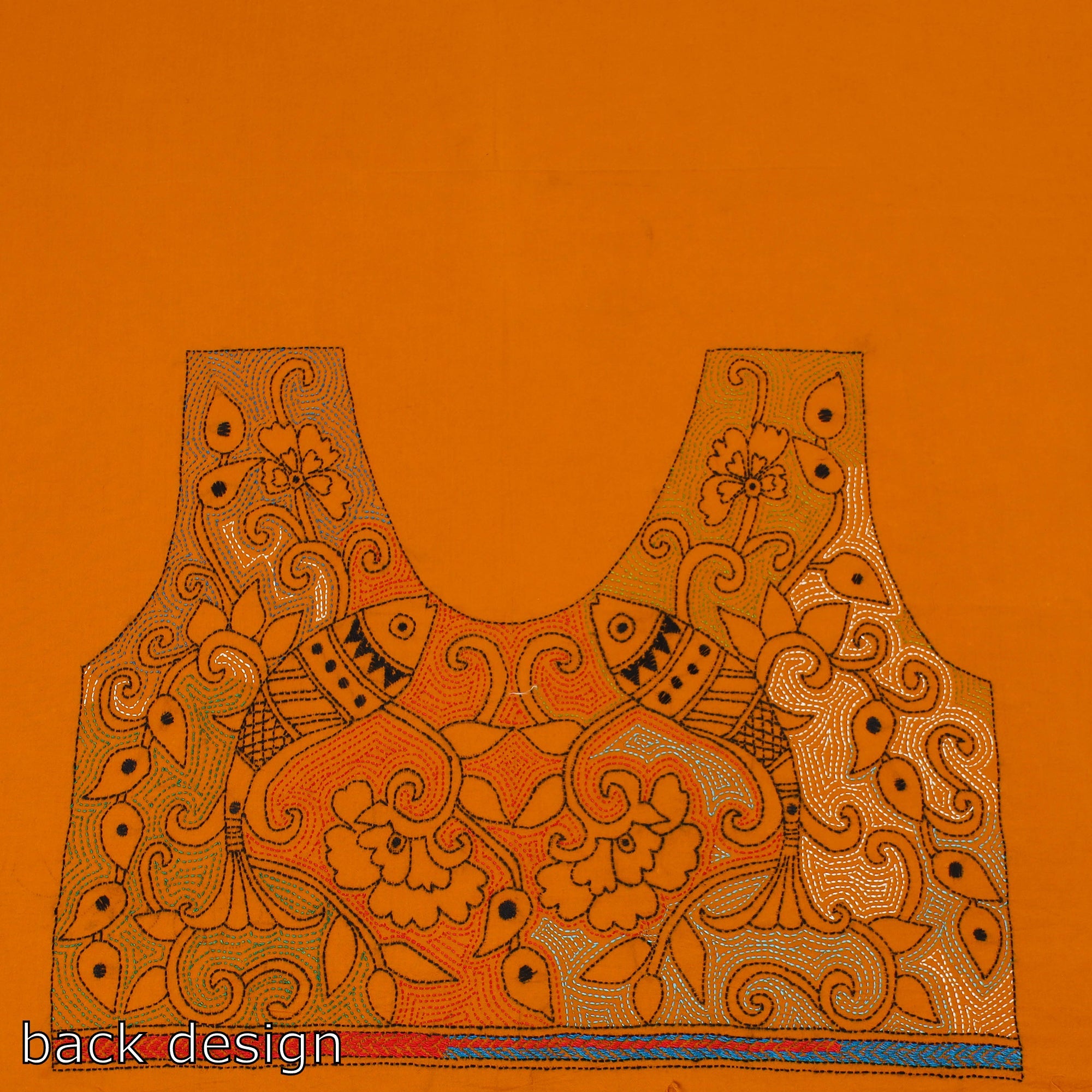 This stunning orange bengal kantha hand embroidery cotton blouse piece showcases the artistry of West Bengal’s Kantha work. Customize it to your preferred style and pair it with your cherished sarees for a chic and culturally-inspired look. Perfect for special occasions and celebrations.