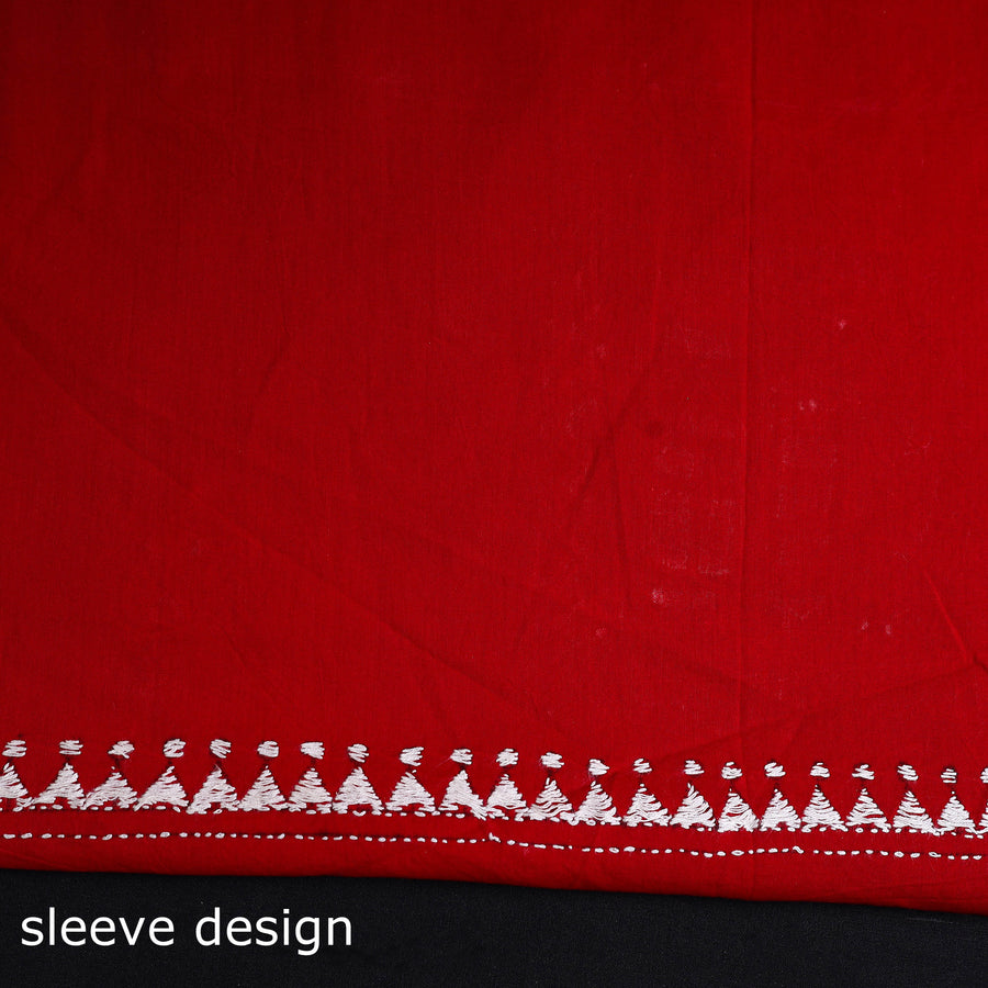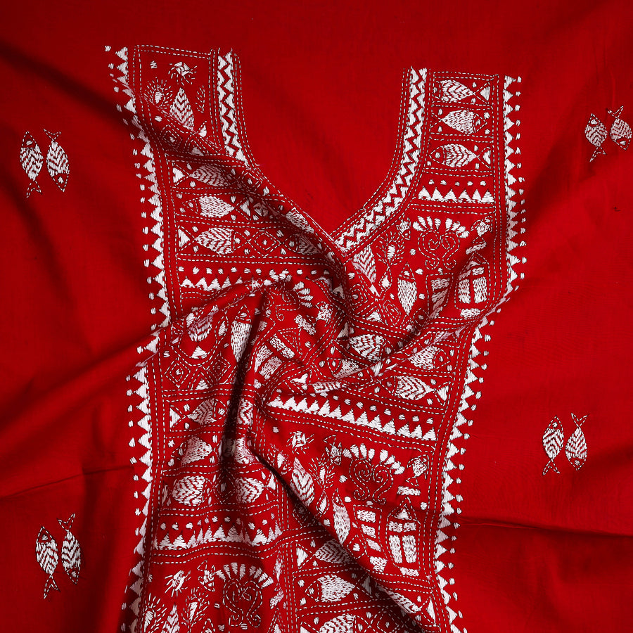 This red bengal kantha embroidered cotton kurta material, designed with contemporary patterns & has been embroidered using West Bengal's traditional craft technique of Kantha.