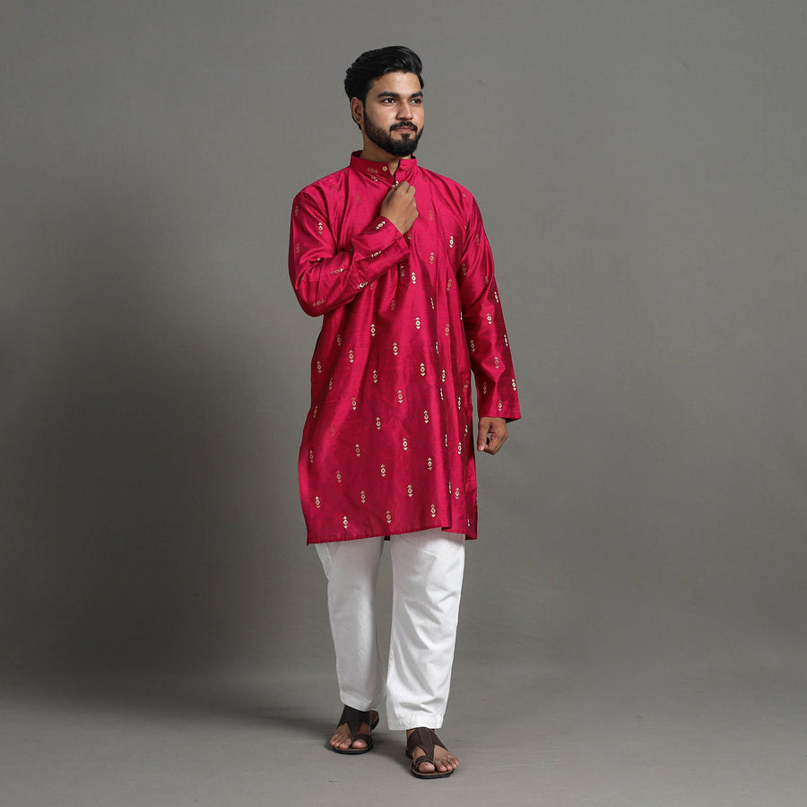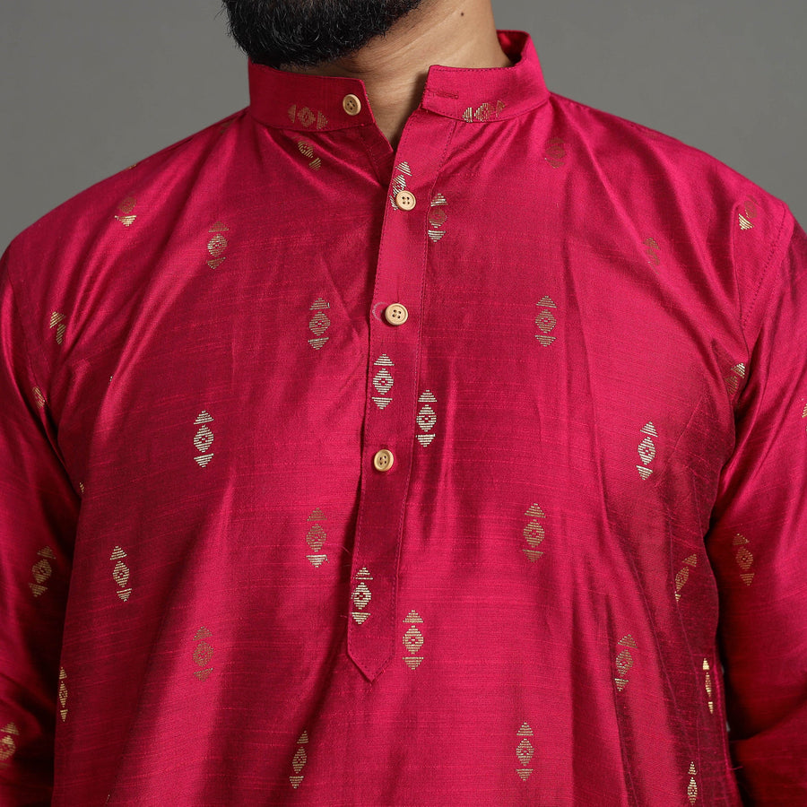 This fine-quality plain spun dupion viscose silk men’s kurta is designed for effortless style and comfort. With full sleeves, a chinese collar, and two convenient side pockets, this kurta brings together traditional elegance and modern practicality. Perfect for casual outings or special occasions, its soft yet durable silk fabric offers all-day ease.