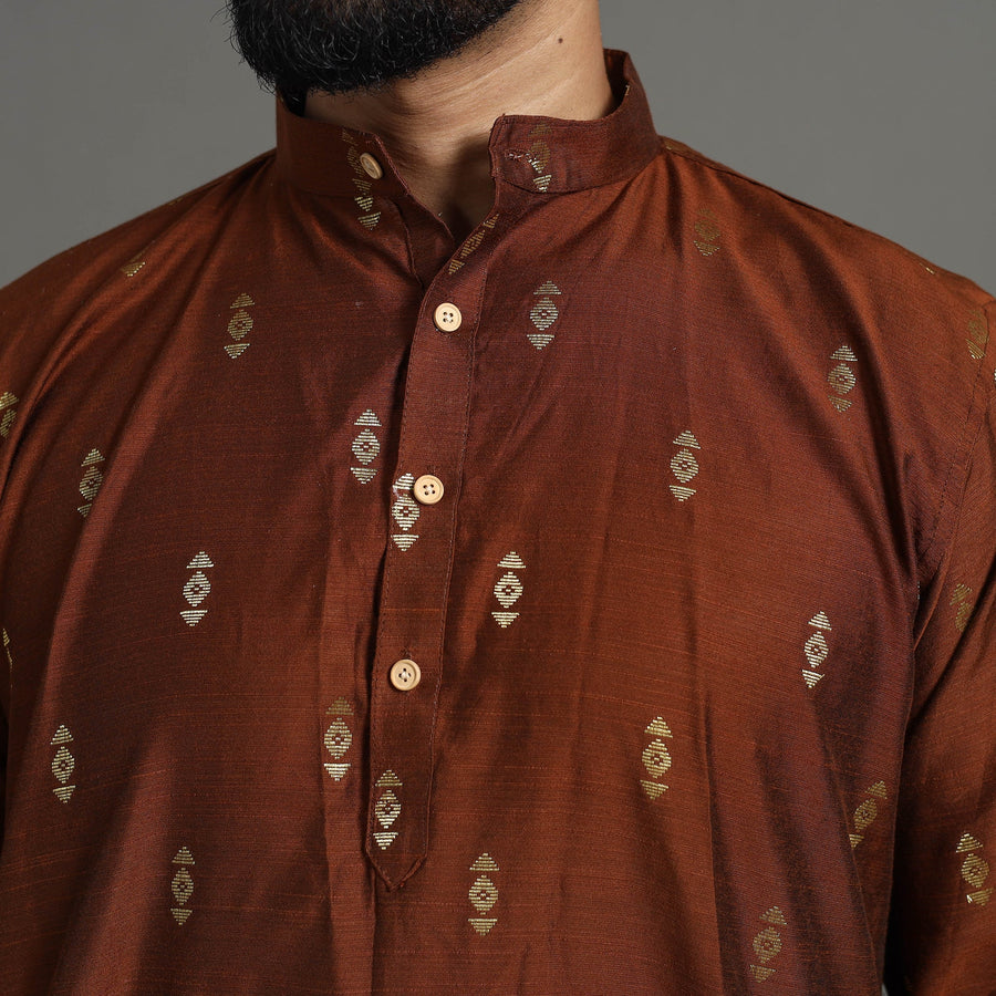 This fine-quality plain spun dupion viscose silk men’s kurta is designed for effortless style and comfort. With full sleeves, a chinese collar, and two convenient side pockets, this kurta brings together traditional elegance and modern practicality. Perfect for casual outings or special occasions, its soft yet durable silk fabric offers all-day ease.