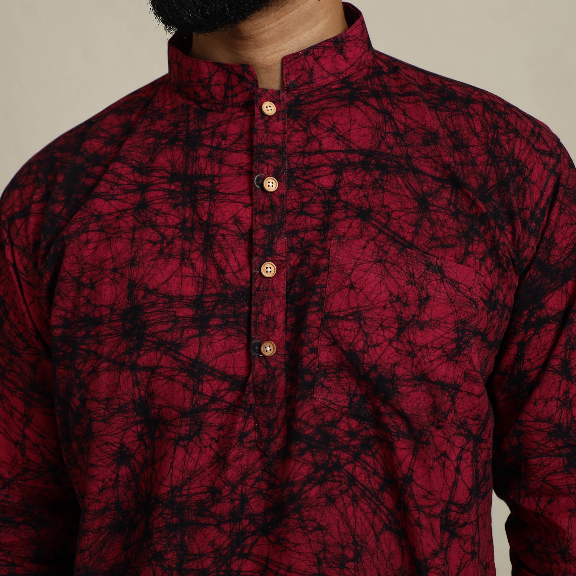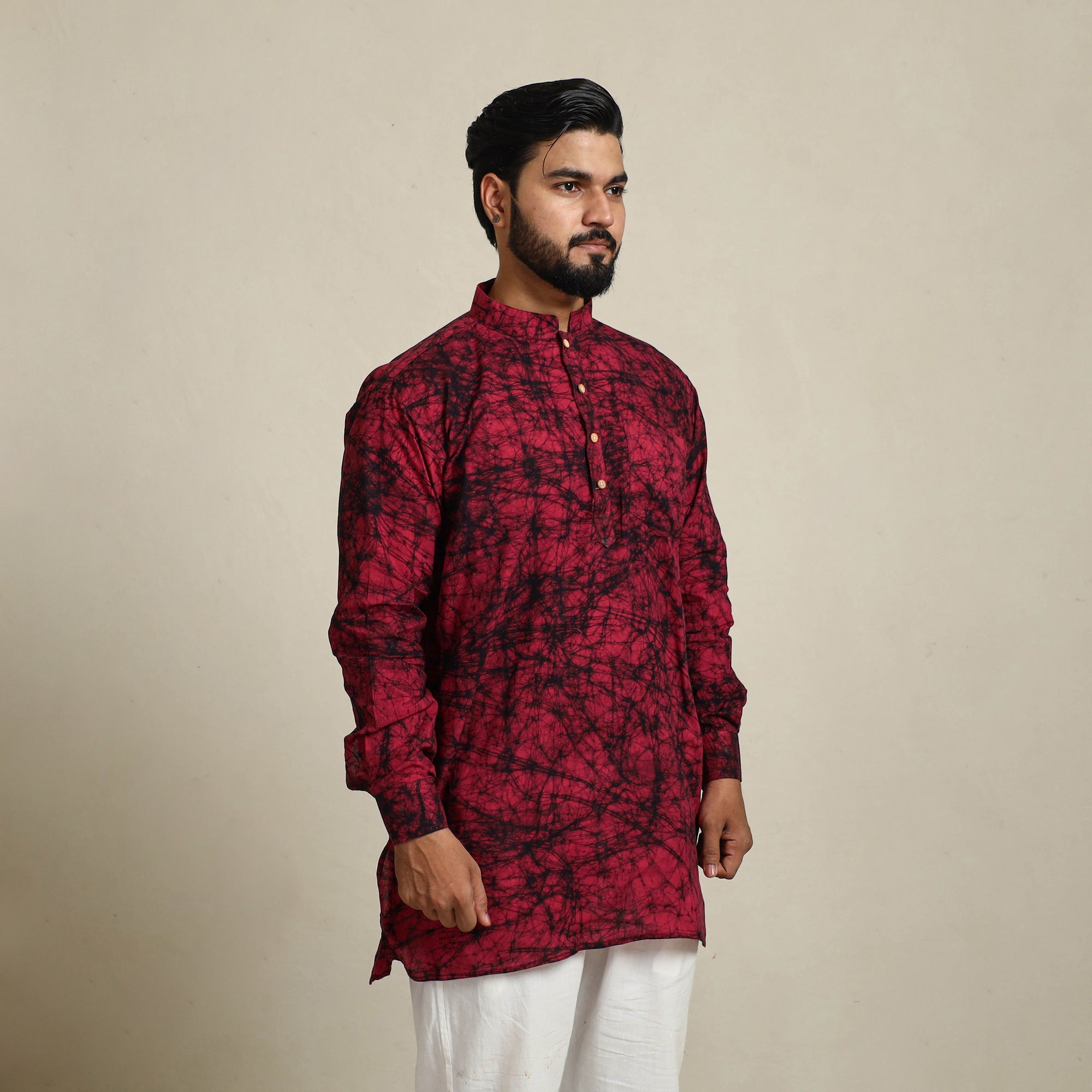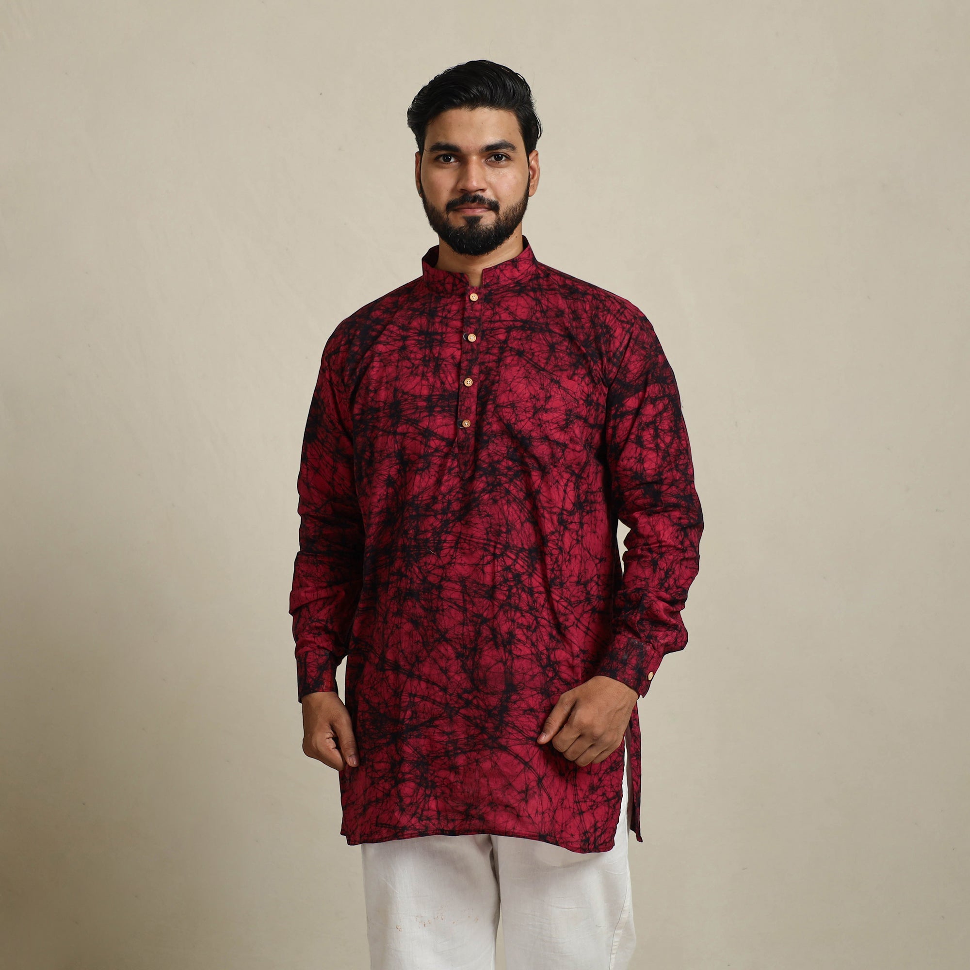This exquisite men short hand batik print kurta blends traditional craftsmanship with modern comfort. Made from cotton, it features full sleeves, a chinese collar, and patch pocket on the front. Ideal for festive occasions or casual outings, this kurta brings style and heritage together.