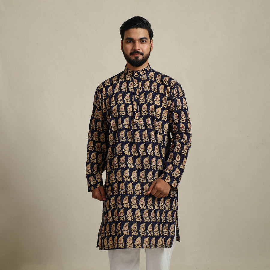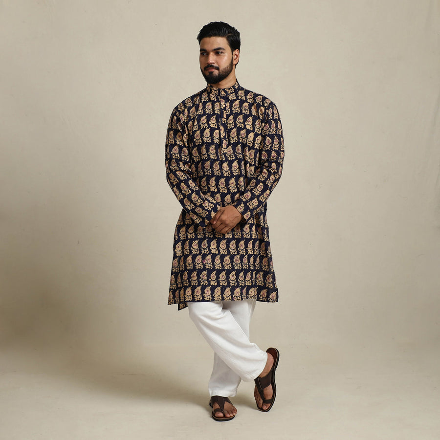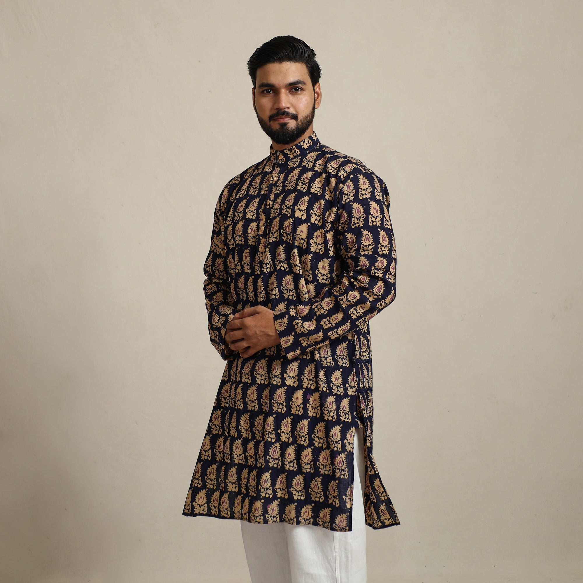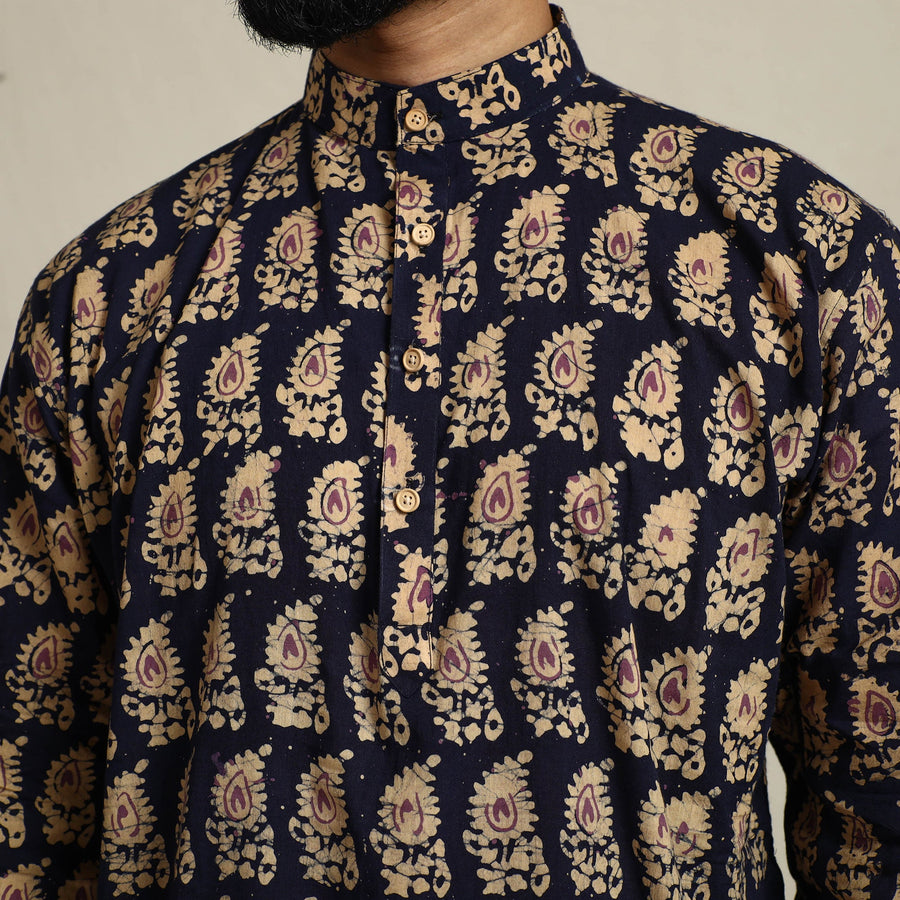 This exquisite men long hand batik print kurta blends traditional craftsmanship with modern comfort. Made from cotton, it features full sleeves, a chinese collar, and convenient two side pockets for your essentials. Ideal for festive occasions or casual outings, this kurta brings style and heritage together.