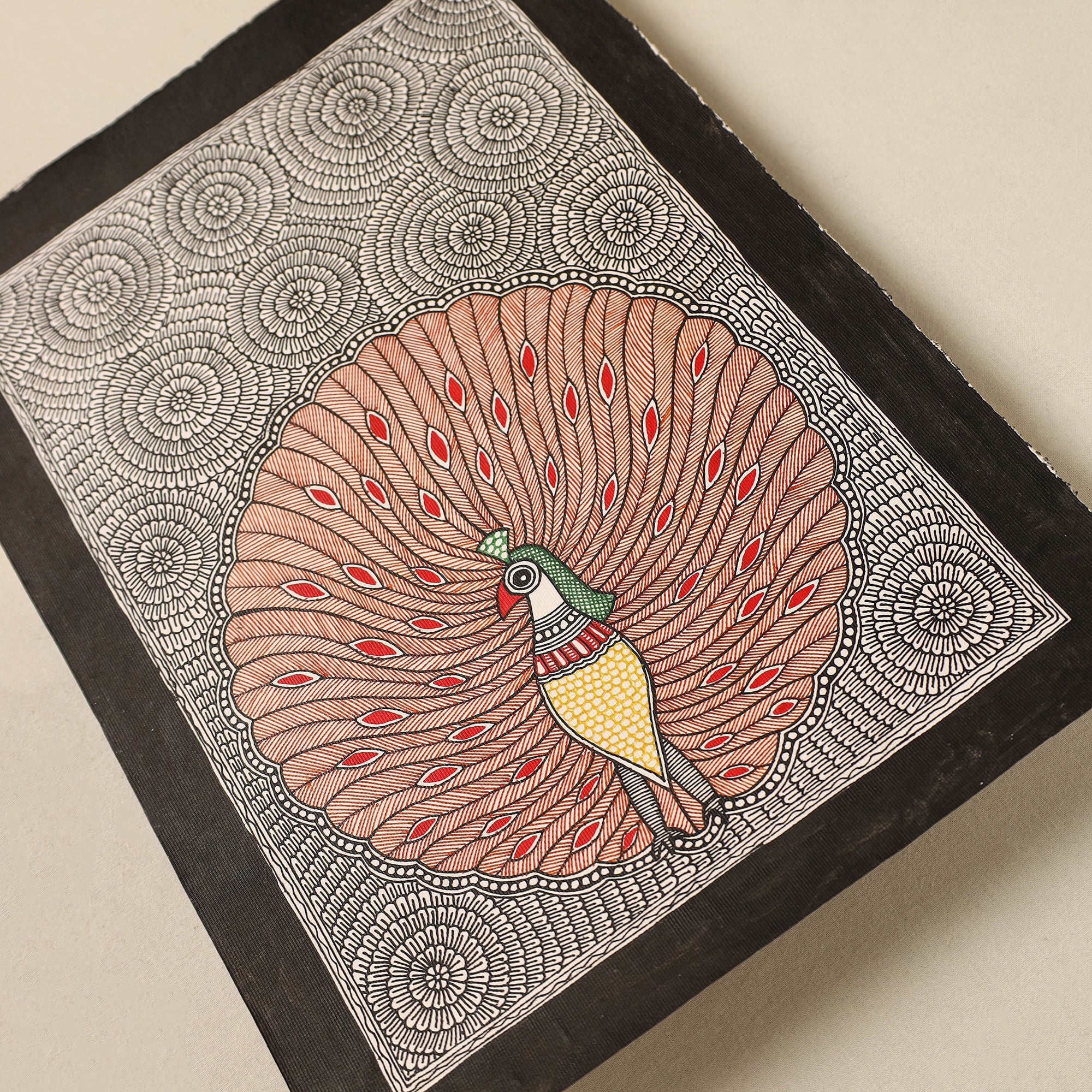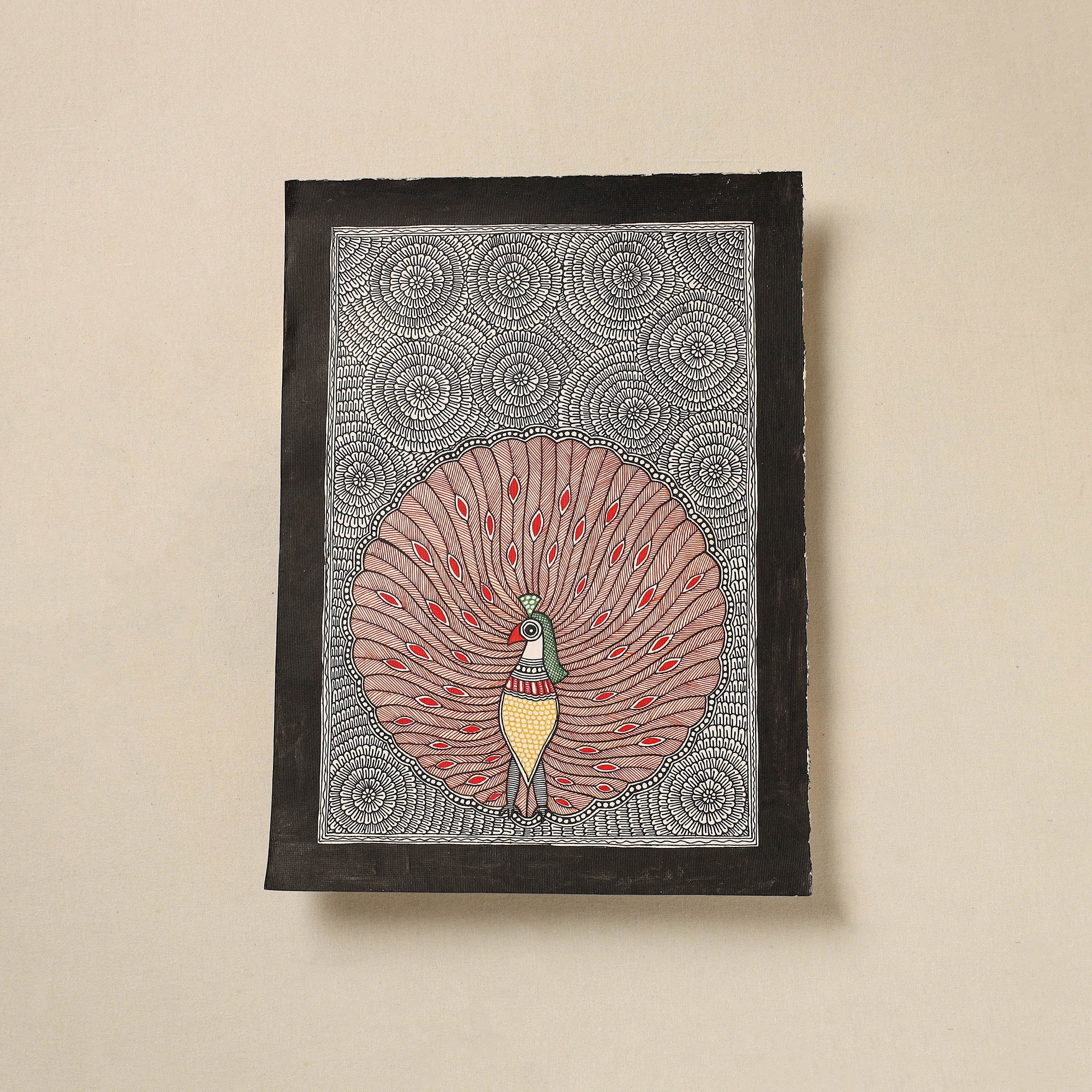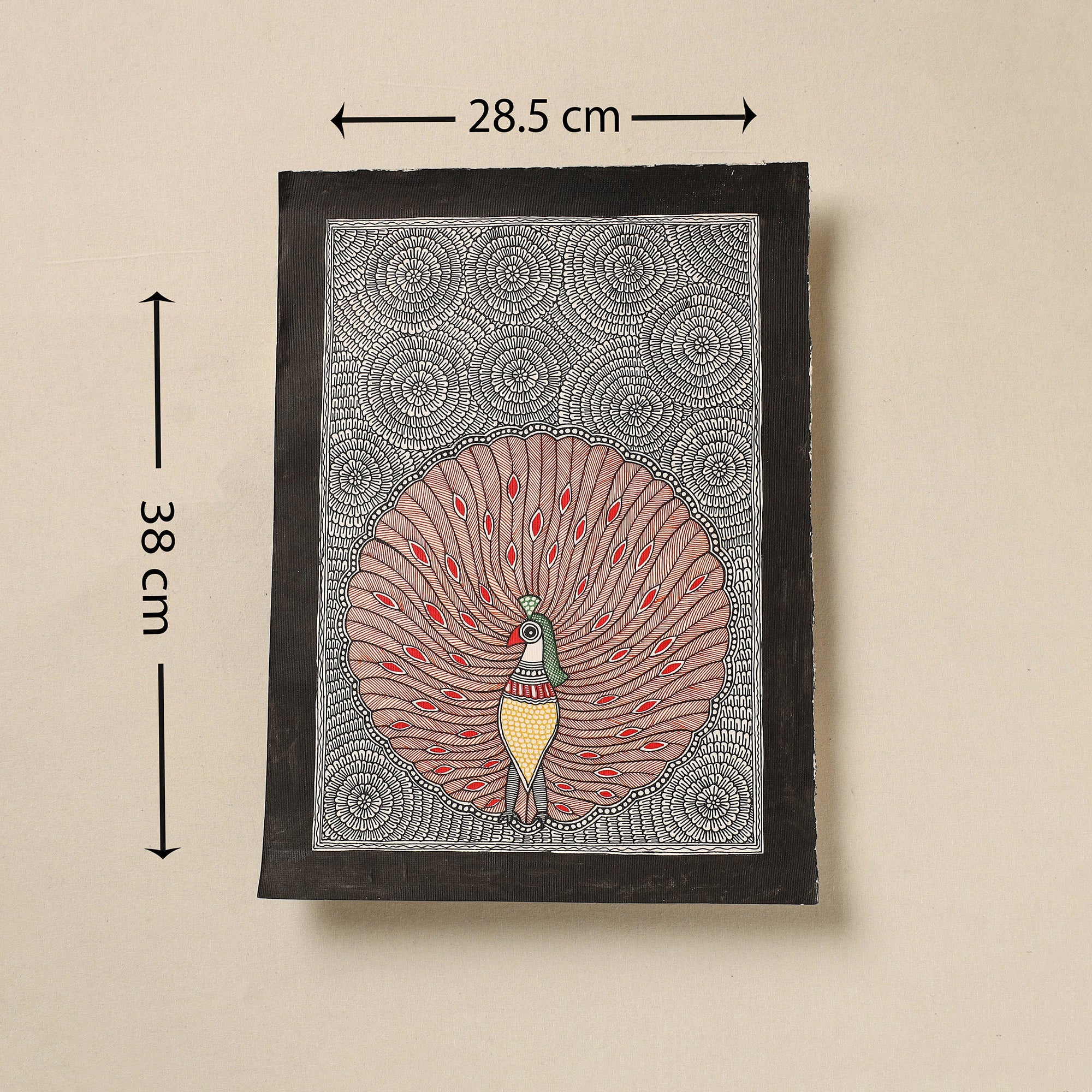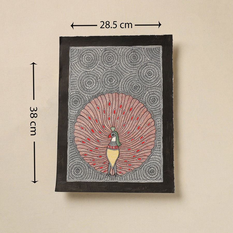 Bring home the essence of Mithla with this handpainted Madhubani painting by renowned artisan Hira Devi. Crafted on handmade paper, made using natural colours and permanent ink, making it a timeless piece. Madhubani painting, known for its folk style, showcases India's rich cultural heritage.