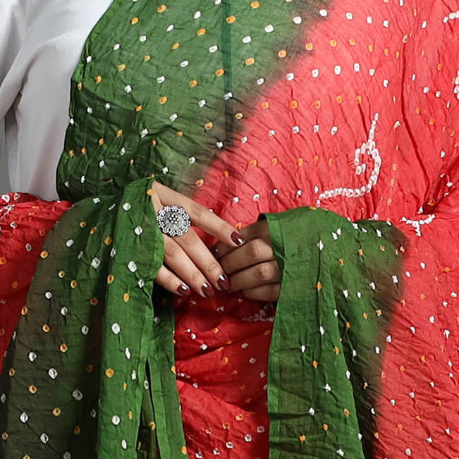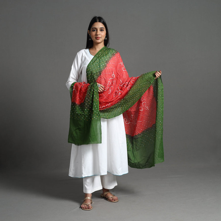 Experience the of Kutch's traditional green tie-dye artistry with cotton bandhani dupatta. Each dupatta is crafted by skilled artisans using the bandhej technique, where the fabric is tied at various points before being dyed to create intricate patterns. Made from cotton, it’s perfect for festive occasions and everyday wear.