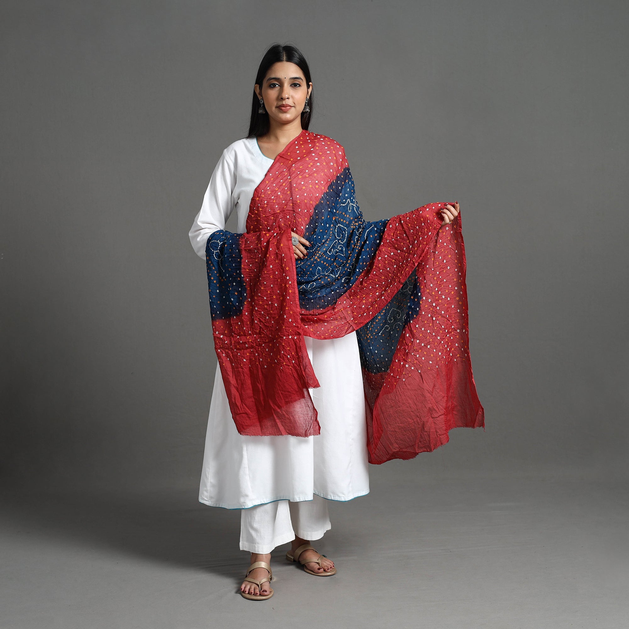 Experience the of Kutch's traditional red tie-dye artistry with cotton bandhani dupatta. Each dupatta is crafted by skilled artisans using the bandhej technique, where the fabric is tied at various points before being dyed to create intricate patterns. Made from cotton, it’s perfect for festive occasions and everyday wear.