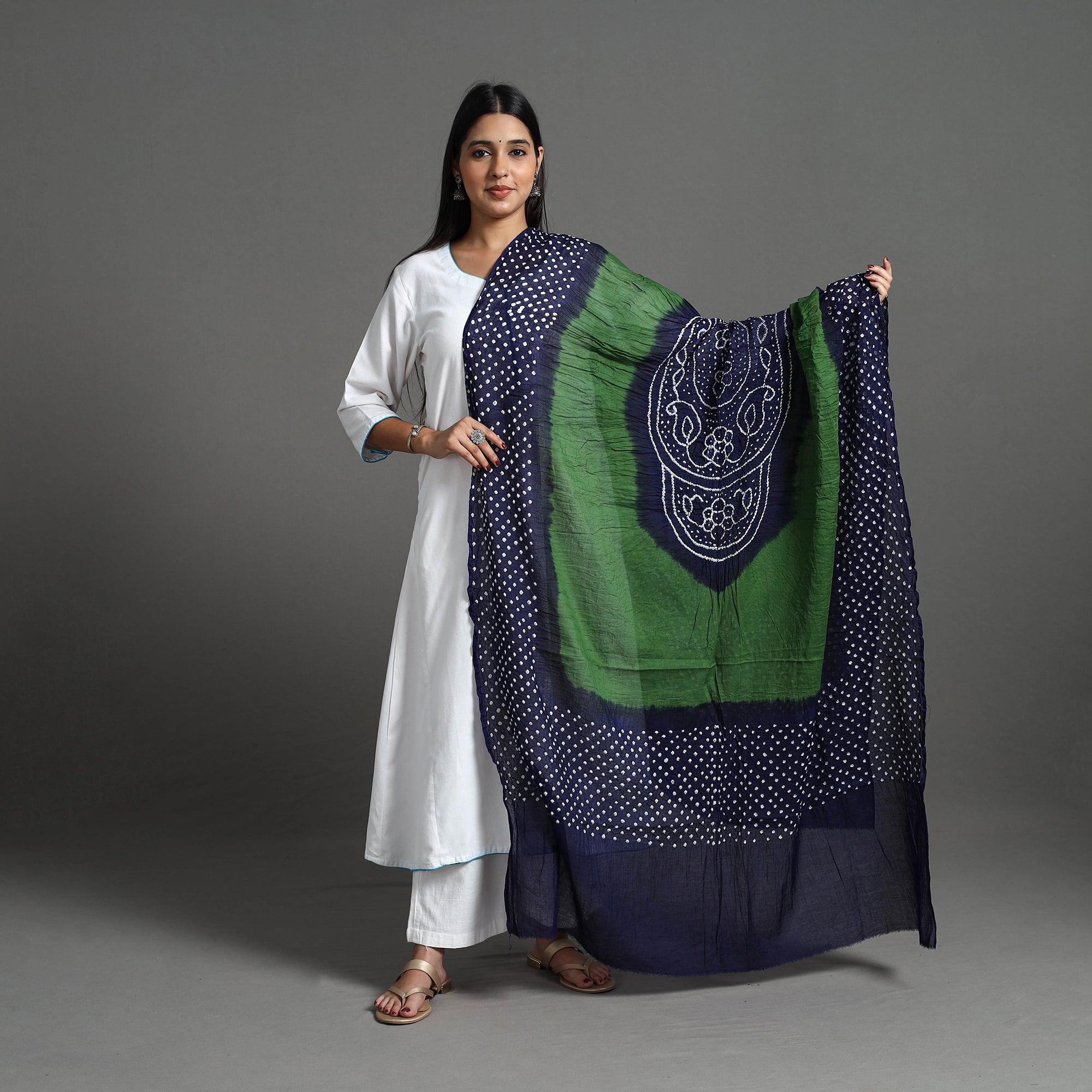 Experience the of Kutch's traditional blue tie-dye artistry with cotton bandhani dupatta. Each dupatta is crafted by skilled artisans using the bandhej technique, where the fabric is tied at various points before being dyed to create intricate patterns. Made from cotton, it’s perfect for festive occasions and everyday wear.