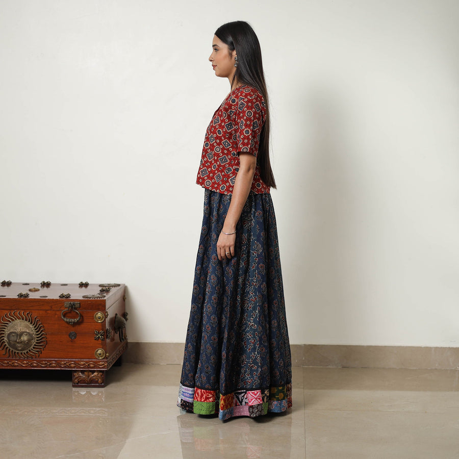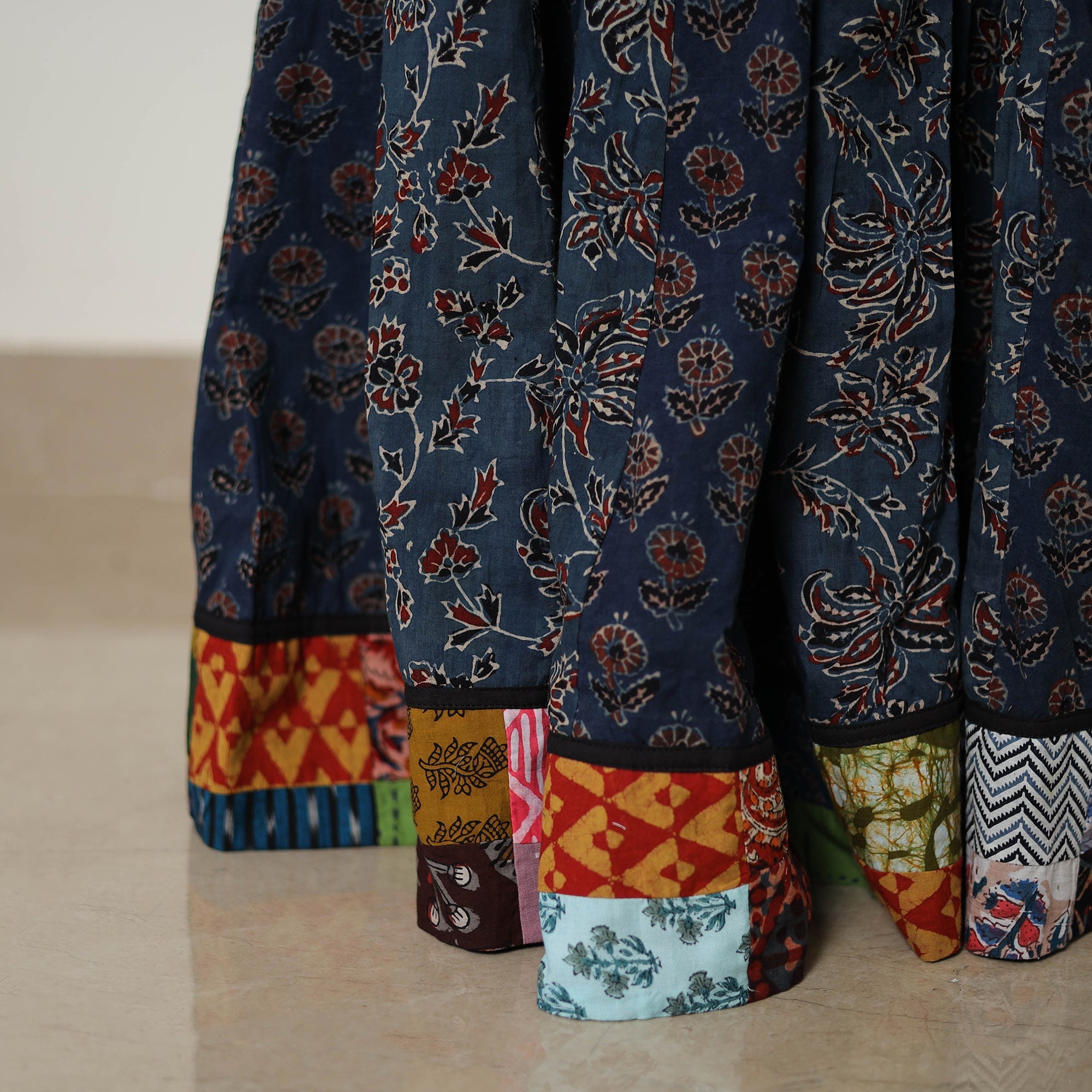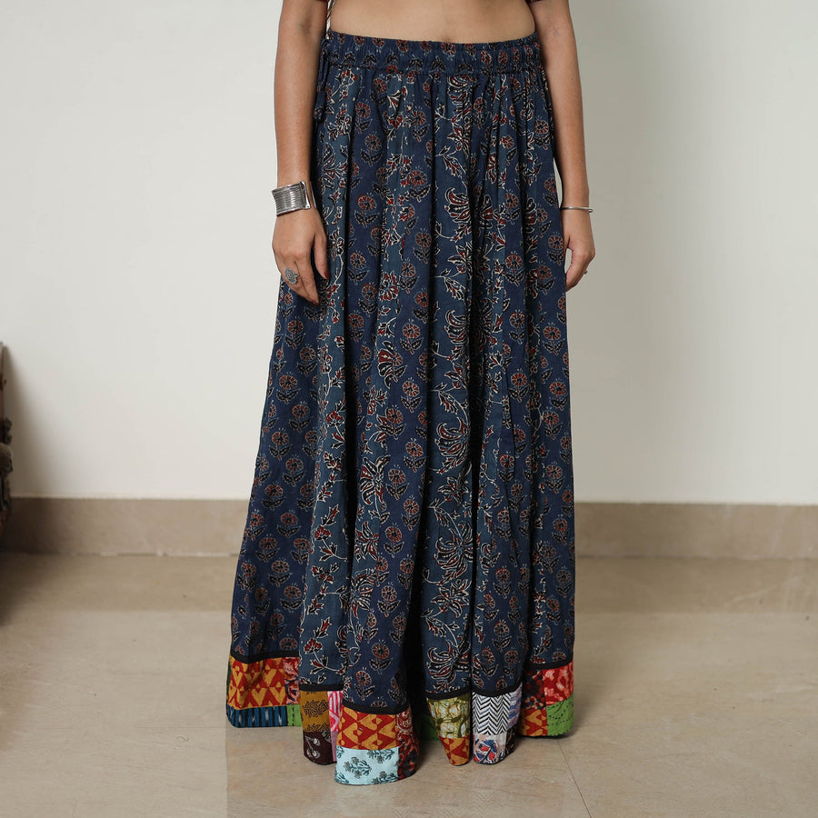 This handcrafted blue 24 kali patchwork block printed cotton ajrakh skirt celebrates the timeless artistry of Gujarat's Kutch region. Made from natural-dyed cotton, this 24 Kali patchwork long skirt is a testament to eco-friendly fashion and exquisite craftsmanship. Featuring a wrap-around tie-up closure for a personalized fit, it blends traditional design with modern comfort. Ideal for casual outings or semi-formal gatherings, this skirt showcases vibrant patterns and cultural heritage. Explore more artisan stories and shop sustainably today.