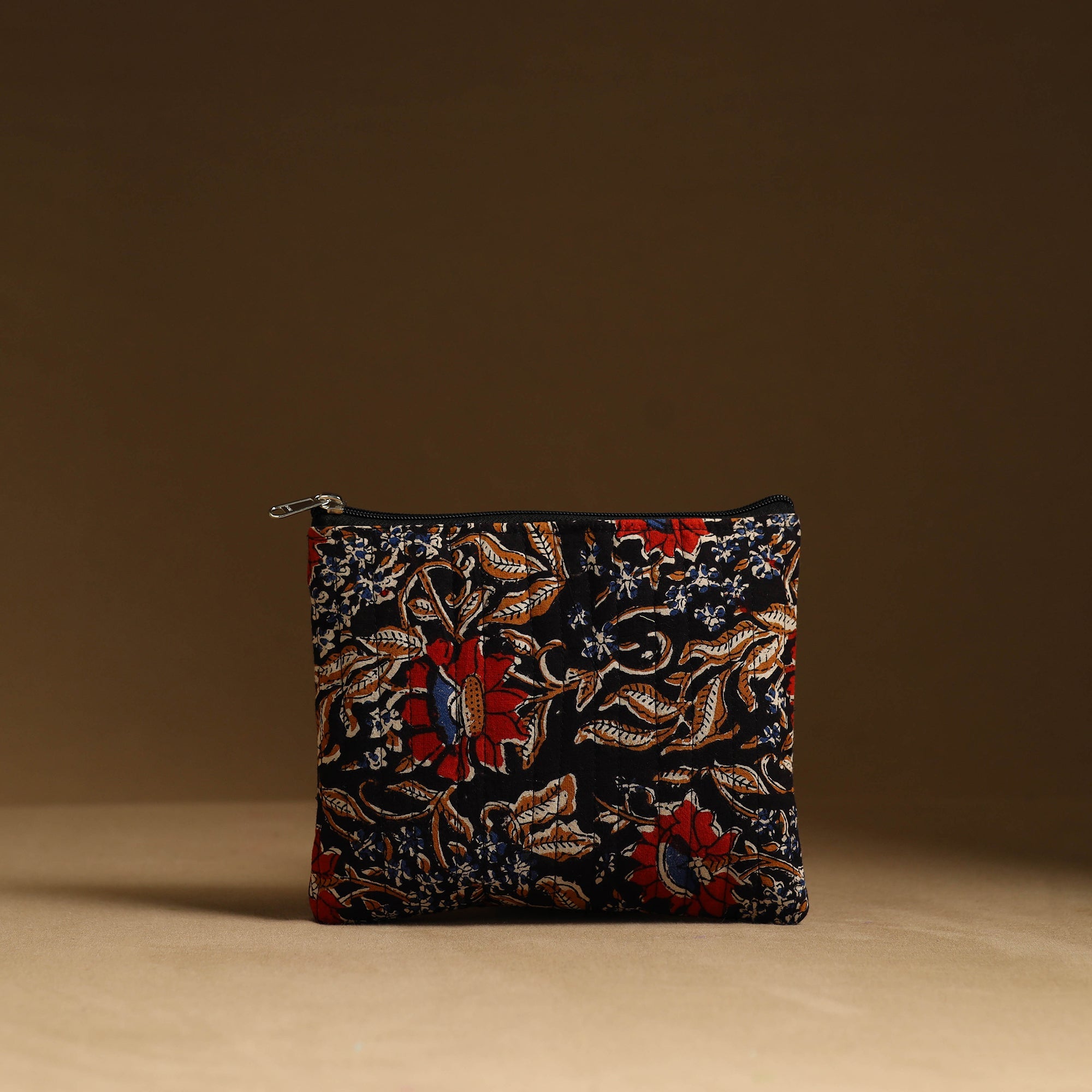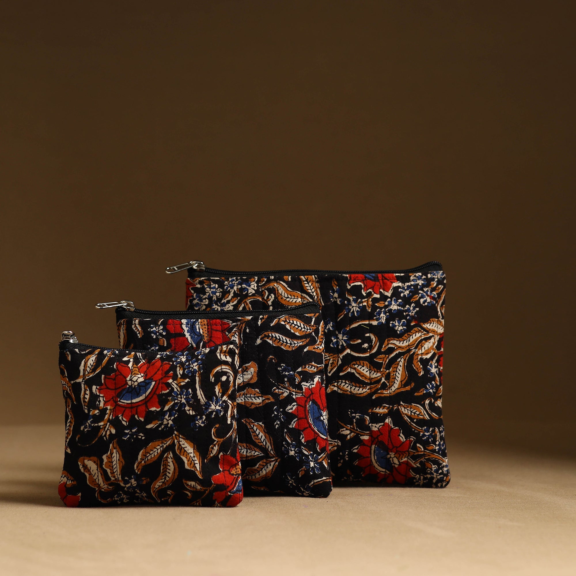 Keep your essentials organized with our black handmade cotton utility pouch set. The handcrafted bag set serves as a multipurpose solution for storing makeup, jewelry, medicines, stationery, and more. The foam layer lining ensures durability and protection. These eco-friendly pouches are both stylish and functional. These pouches are having a smooth zipper closure.