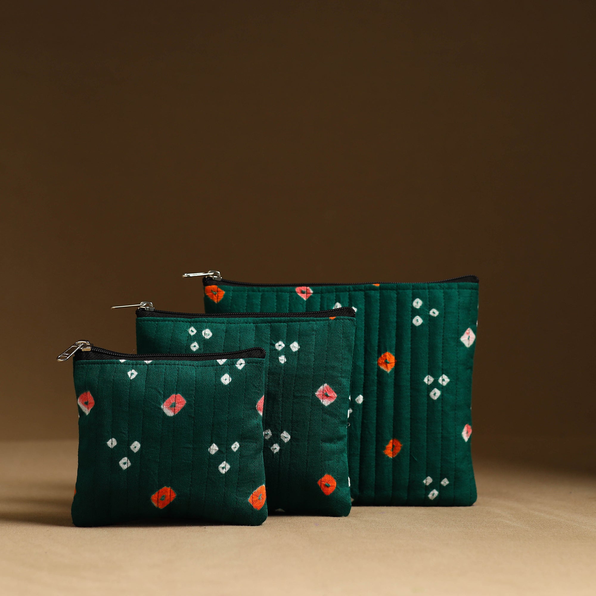 Keep your essentials organized with our green handmade cotton utility pouch set. The handcrafted bag set serves as a multipurpose solution for storing makeup, jewelry, medicines, stationery, and more. The foam layer lining ensures durability and protection. These eco-friendly pouches are both stylish and functional. These pouches are having a smooth zipper closure.