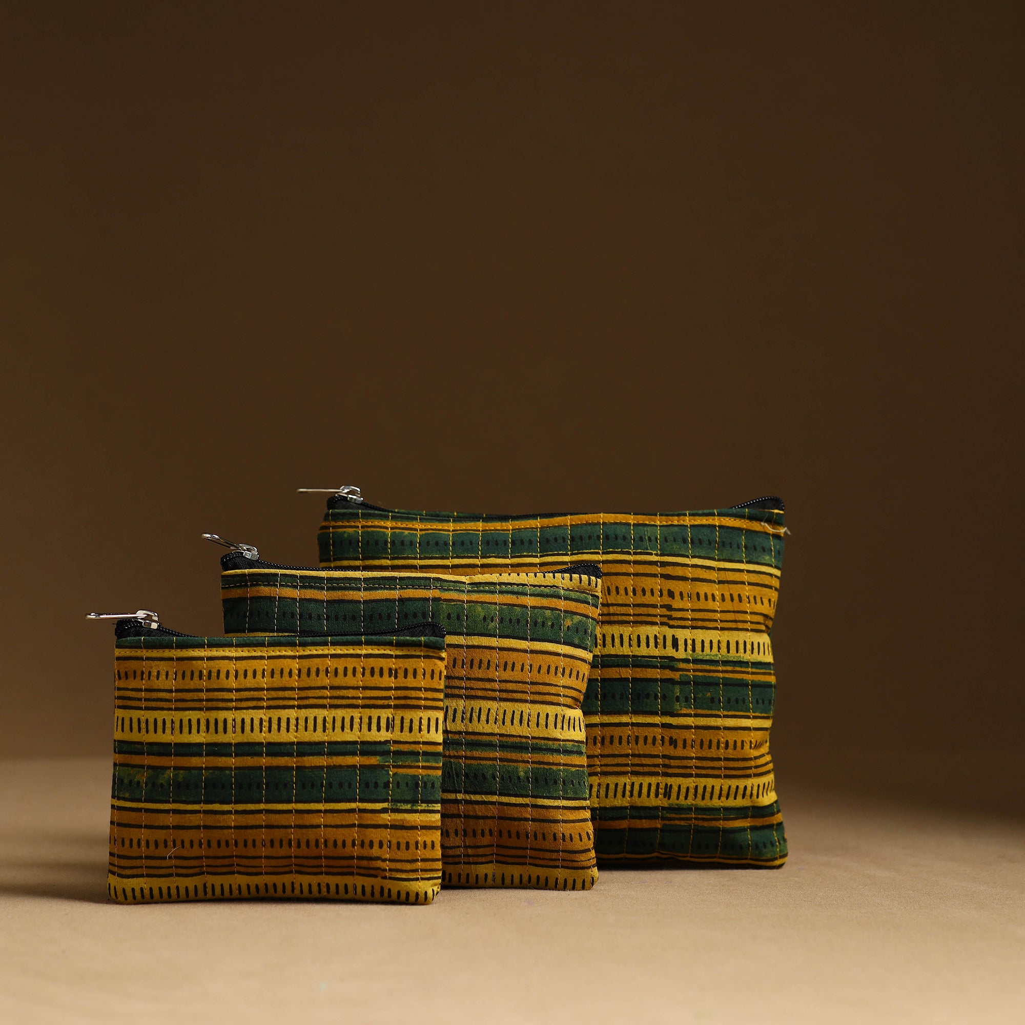 Keep your essentials organized with our multicolor handmade cotton utility pouch set. The handcrafted bag set serves as a multipurpose solution for storing makeup, jewelry, medicines, stationery, and more. The foam layer lining ensures durability and protection. These eco-friendly pouches are both stylish and functional. These pouches are having a smooth zipper closure.