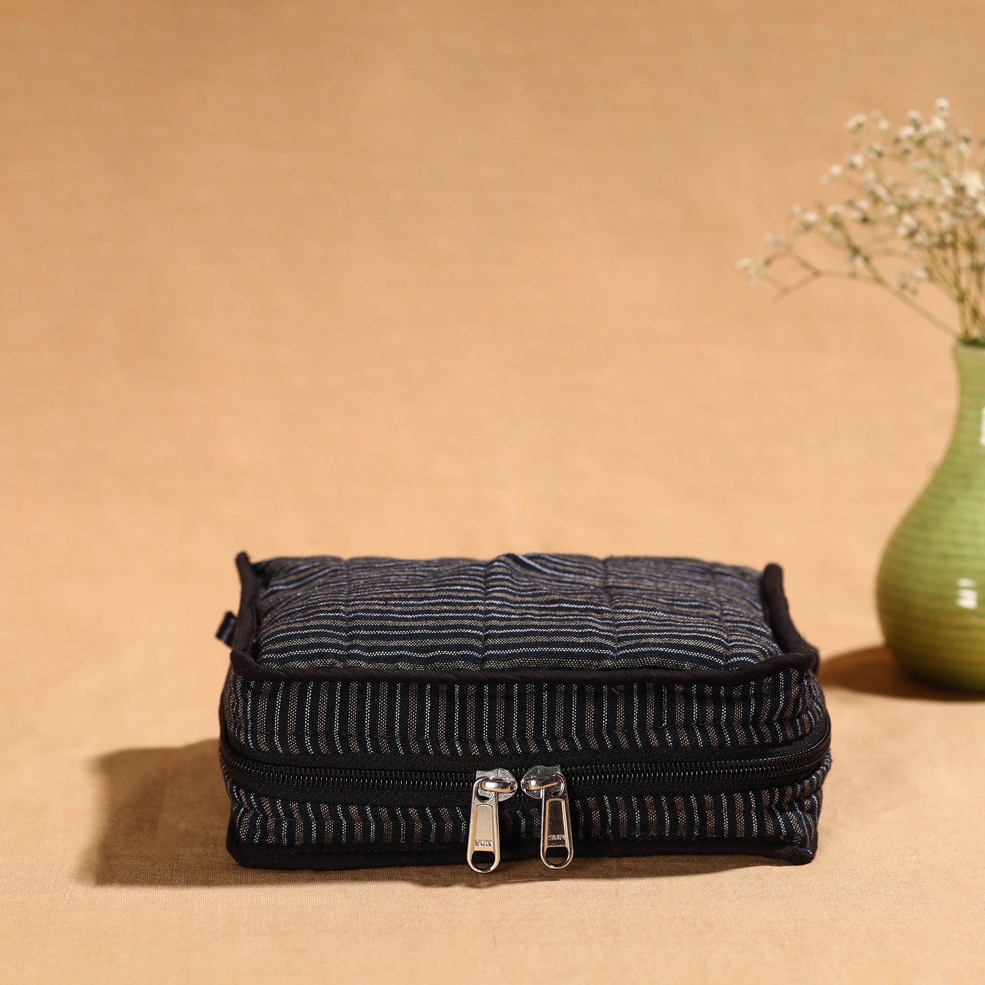 This black handmade 4-pockets cotton jewellery bag can be used for store jewellery, makeup items, cosmetic and other small stuffs. This is compact enough to fit in your luggage wherever you travel while keeping your jewellery well organized.
