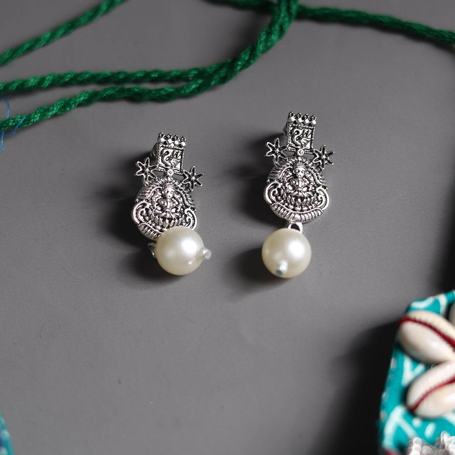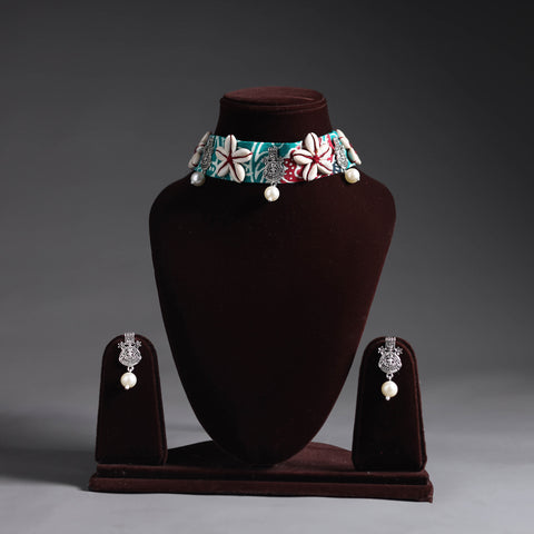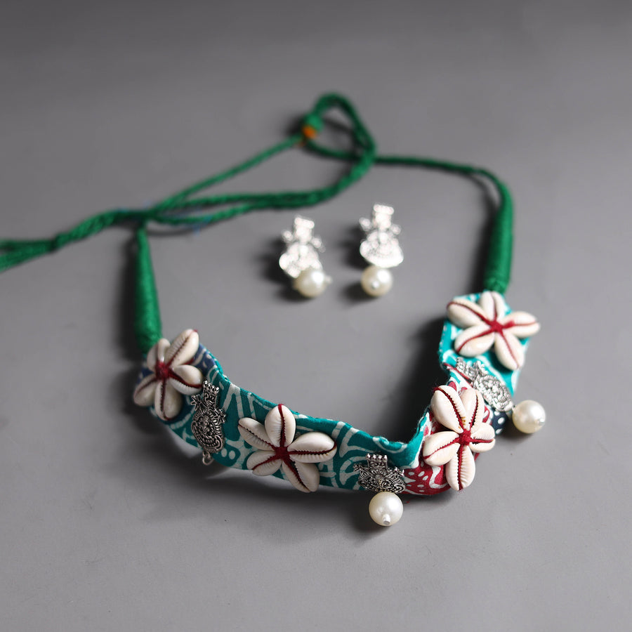 Add a touch of tradition to your jewellery with the green handcrafted GS fabart choker necklace set. This exquisite piece is crafted from fabric, featuring detailed german silver, shell, and fine thread work that embodies the rich cultural heritage of Indian artisans. Each necklace is a testament to the skill of our artisans.