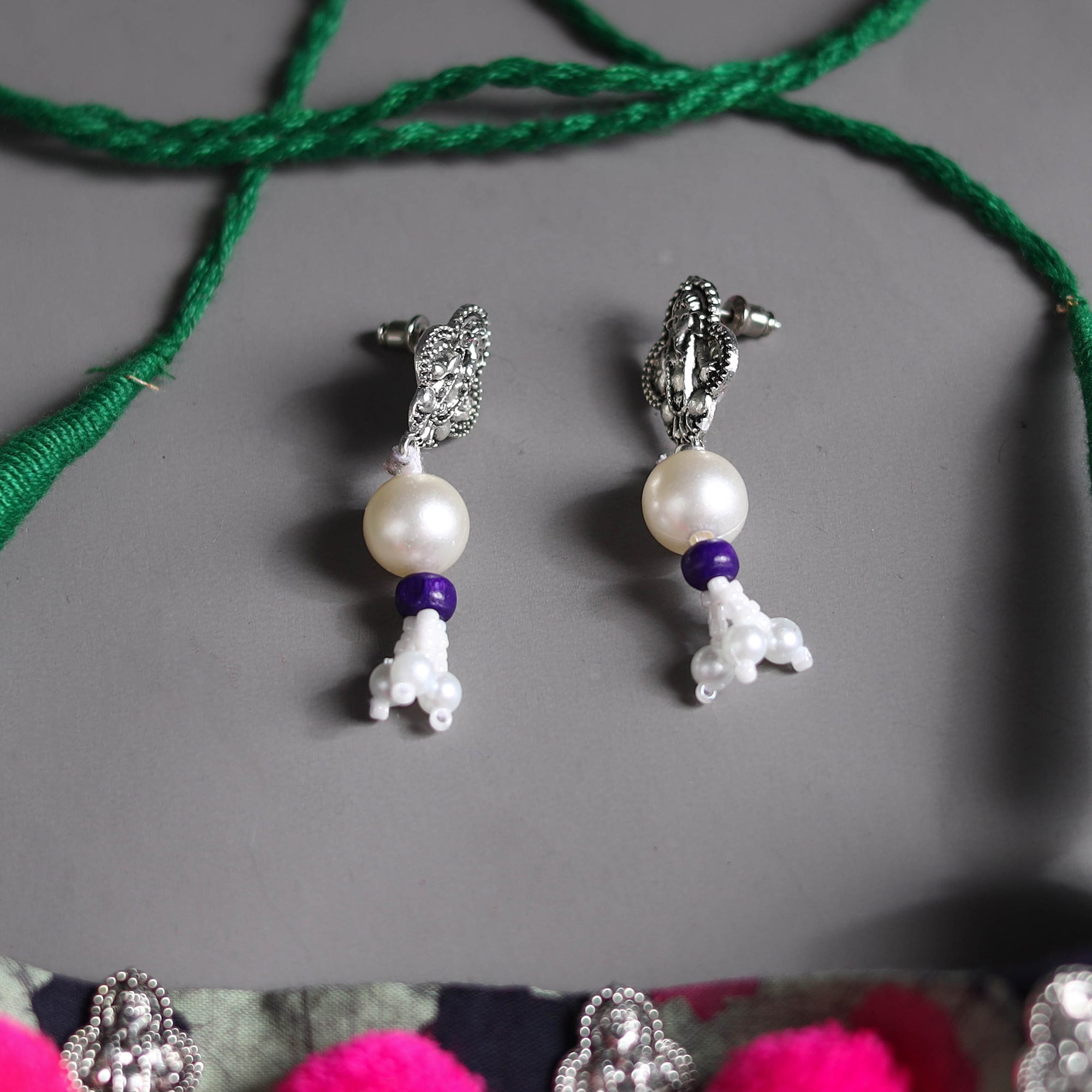 Add a touch of tradition to your jewellery with the pink handcrafted GS fabart choker necklace set. This exquisite piece is crafted from fabric, featuring detailed german silver, shell, and fine thread work that embodies the rich cultural heritage of Indian artisans. Each necklace is a testament to the skill of our artisans.