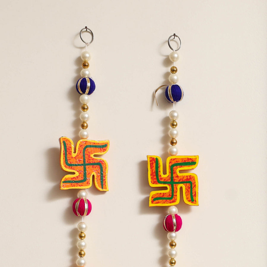| Material | This handmade beadwork wall hanging is the perfect addition to your diwali or festive decor. Crafted by skilled artisans, the design features traditional threadwork, gota, beads, and handpainted wooden, making it a charming addition to diwali or any festive occasion. Its elegant, handmade design brings cultural richness and blessings to your space. |