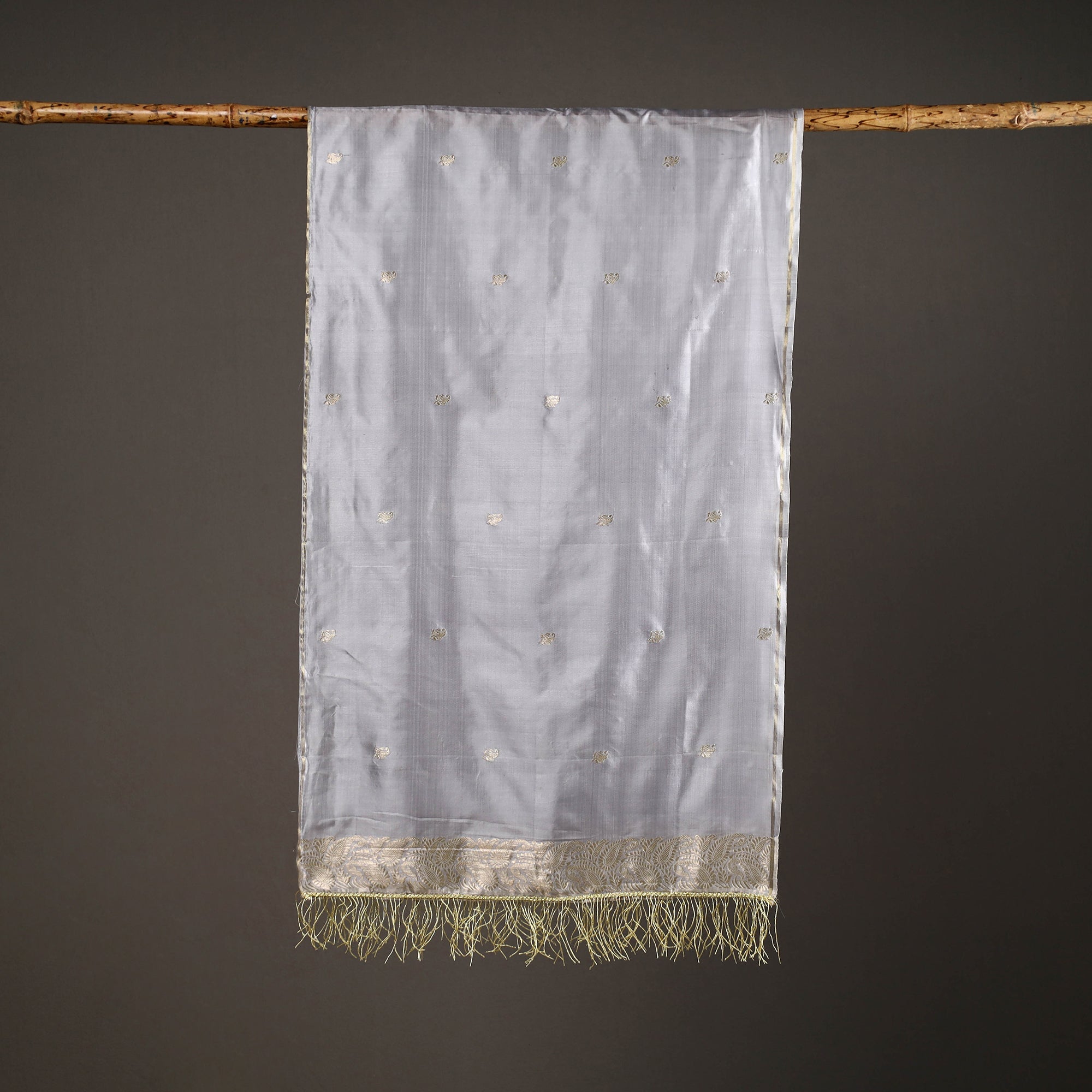 Elevate your look with this grey banarasi silk stole with tassels, handloom by skilled artisans in Banaras. Featuring brocade designs with zari work, this pure silk stole adds a touch of to any outfit. Ideal for formal events or casual outings, Experience the epitome of style and refinement with this stunning accessory.