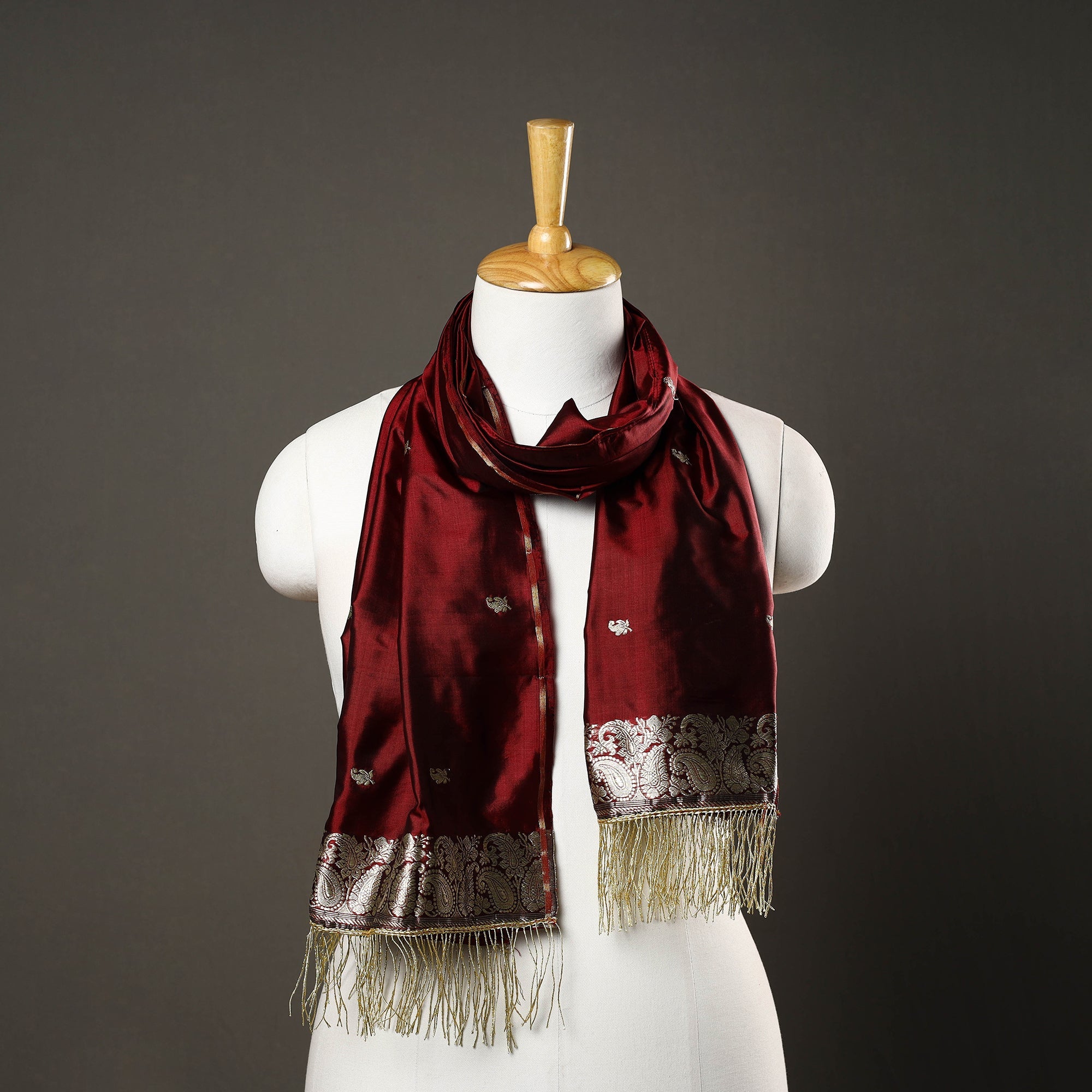 Elevate your look with this maroon banarasi silk stole with tassels, handloom by skilled artisans in Banaras. Featuring brocade designs with zari work, this pure silk stole adds a touch of to any outfit. Ideal for formal events or casual outings, Experience the epitome of style and refinement with this stunning accessory.