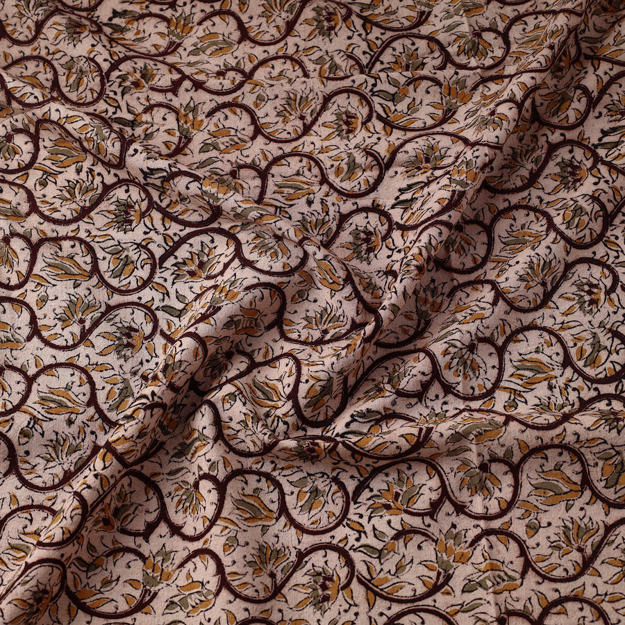 Experience the beauty of brown pedana kalamkari fabric, handcrafted using traditional block printing techniques. Made by skilled artisans in Pedana, Andhra Pradesh. This fabric features natural dyes and intricate patterns, representing India’s rich textile heritage.