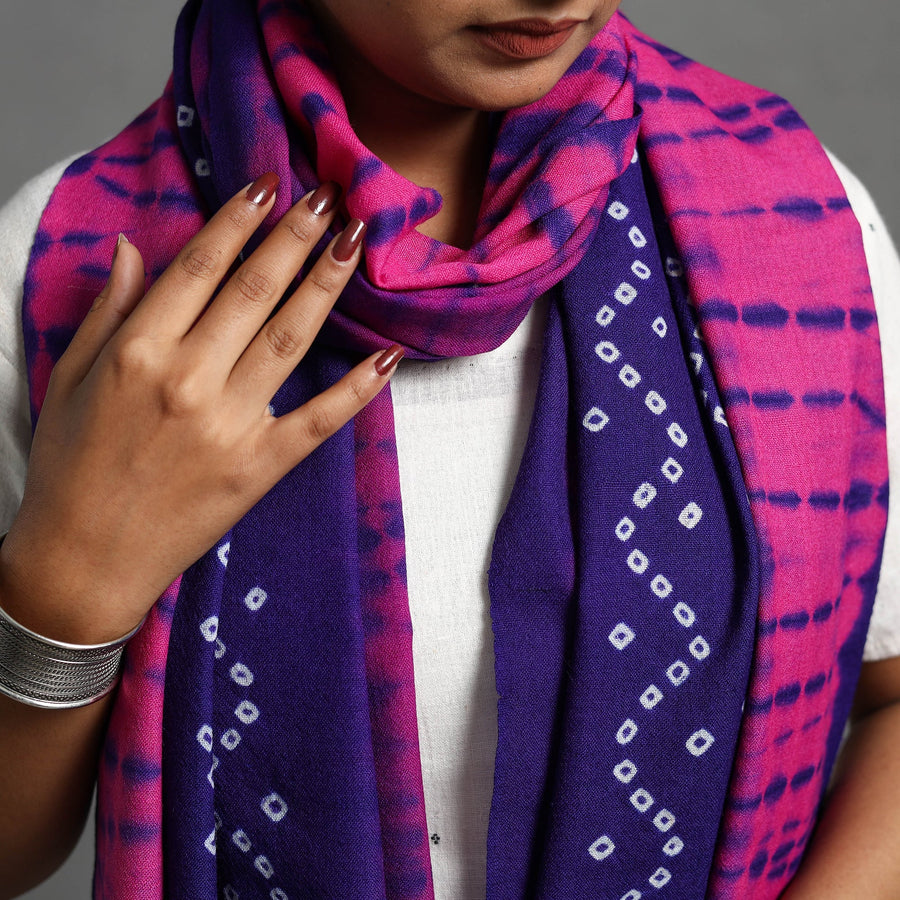This pink handwoven bandhani & shibori woolen stole from Kutch. Featuring the intricate Bandhani and Shibori tie-dye patterns, this stole reflects the rich cultural heritage of Gujarat. The soft wool provides unmatched comfort, making it perfect for winter days. This stole adds a touch of elegance to any outfit.