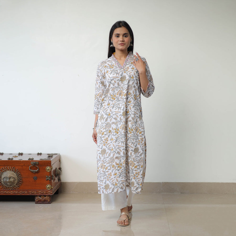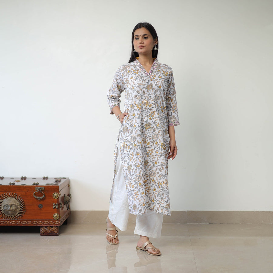 Embrace the timeless beauty of this white block printed cotton straight sanganeri kurta, crafted by skilled artisans. made from cotton ensures comfort throughout the day, while the elegant sanganeri print adds a touch of traditional artistry. With a convenient side pocket and a relaxed fit, this kurta is perfect for both casual outings and special occasions.